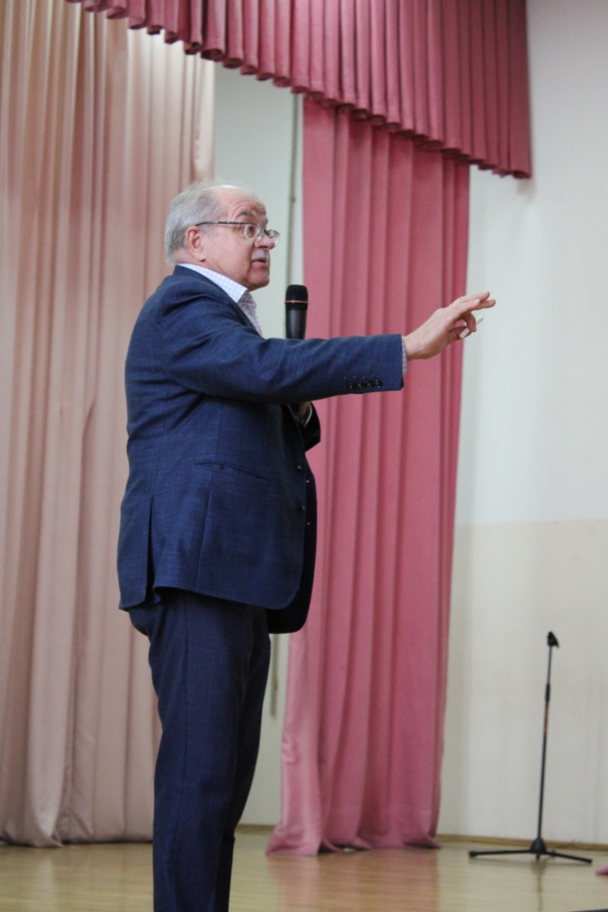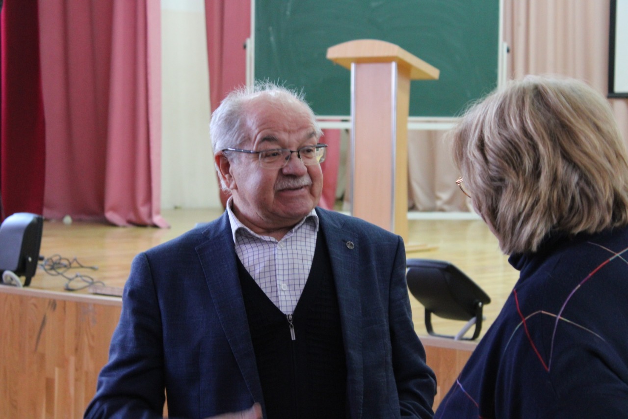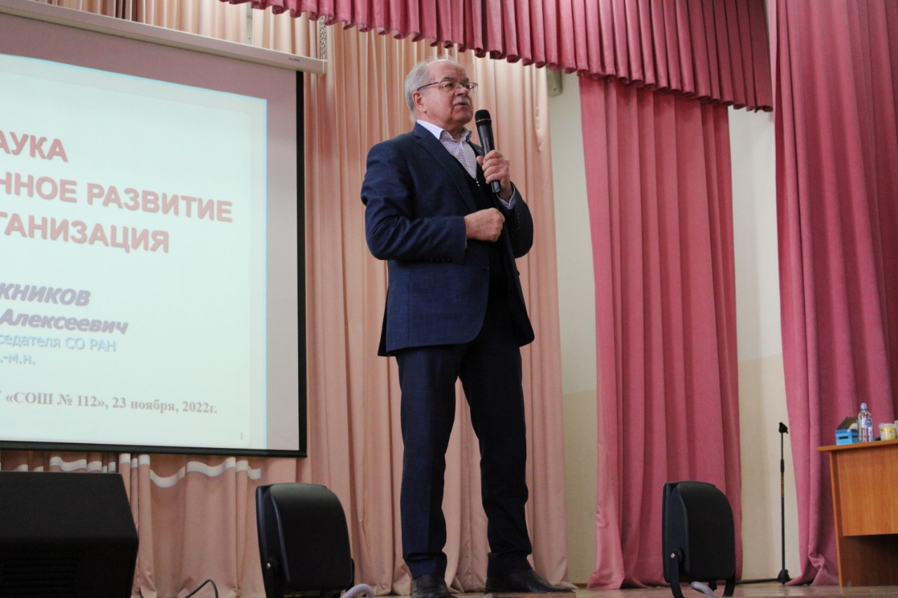 23 ноября в рамках Фестиваля науки в актовом зале школы № 112 Геннадий Алексеевич Сапожников, помощник председателя СО РАН по связям с органами государственной власти, доктор физико-математических наук, прочитал лекцию для школьников 8-11 классов «Осознание мира и себя в нем». Старшеклассники не только увлечённо погружались в понятия: энтропия, хаос и практическое применение постоянной Больцмана, но и с интересом слушали о существующих в сибирском отделении научных школах, их достижениях и истории СО РАН.