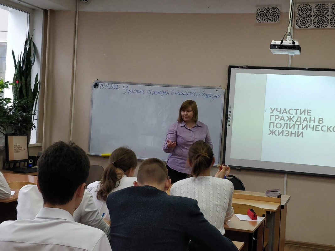 В соответствии с рабочей программой 9-го класса Панина Екатерина Сергеевна, учитель истории и обществознания школы № 131, провела урок по теме «Участие граждан в политической жизни». Цель урока: формирование компетенций гражданственности: гражданского сознания и самосознания учащихся по вопросу участия граждан в политической жизни государства, их правовой и политической культуры. Может ли рядовой гражданин влиять на политику? Кто может принимать участие в управлении государством? Это вопросы, на которые учащиеся нашли ответы вместе с учителем. Екатерина Сергеевна на своем уроке активно работала с учащимися по развитию метапредметных универсальных учебных действий: учились устанавливать причинно-следственные связи и зависимости, получать необходимую информацию из различных источников, аргументировать свою точку зрения, обобщать факты и понятия.