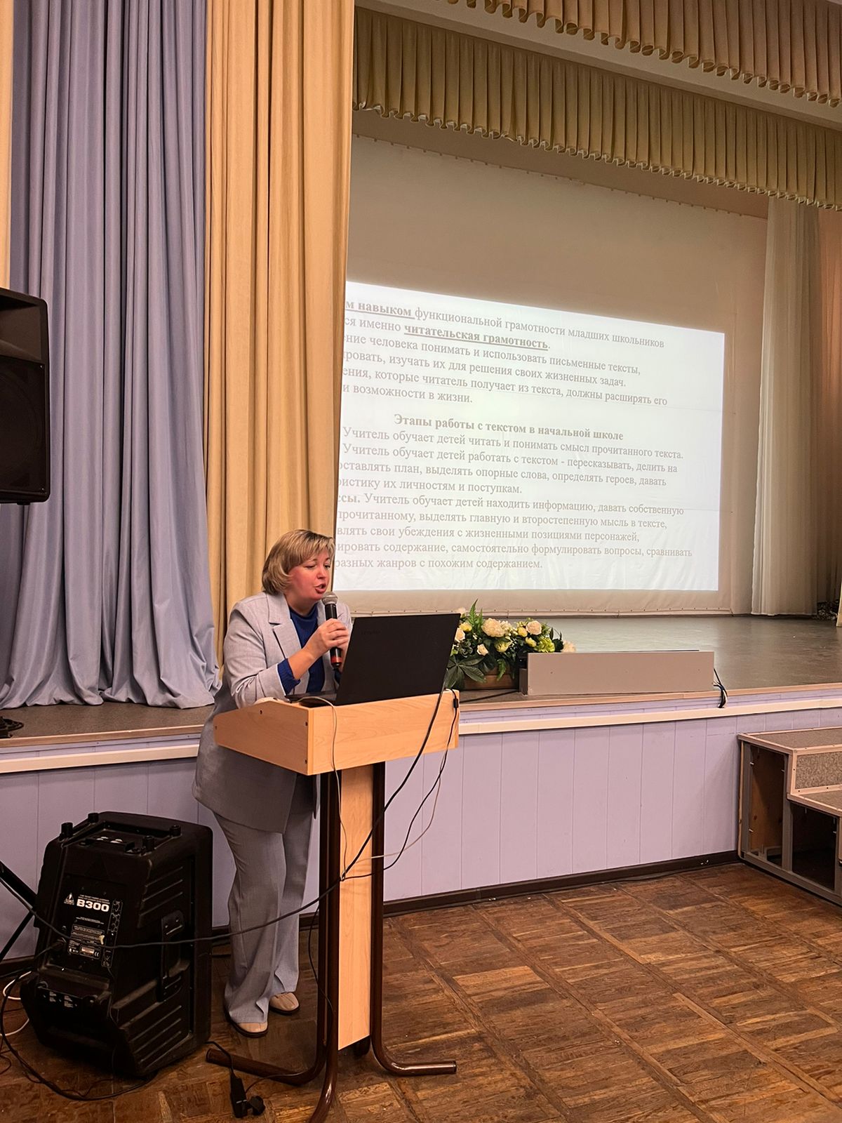 В пленарной части Евгения Анатольевна Кирилина, руководитель районного методического объединения, сделала обзор пособий по формированию различных видов функциональной грамотности таких издательств, как «Планета», «Интеллект-центр», «Принт-Бук» и др.