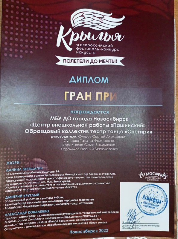 10 декабря Образцовый коллектив «Театр танца «Снегири» принял участие в VI Всероссийском фестивале-конкурсе искусств «Крылья».