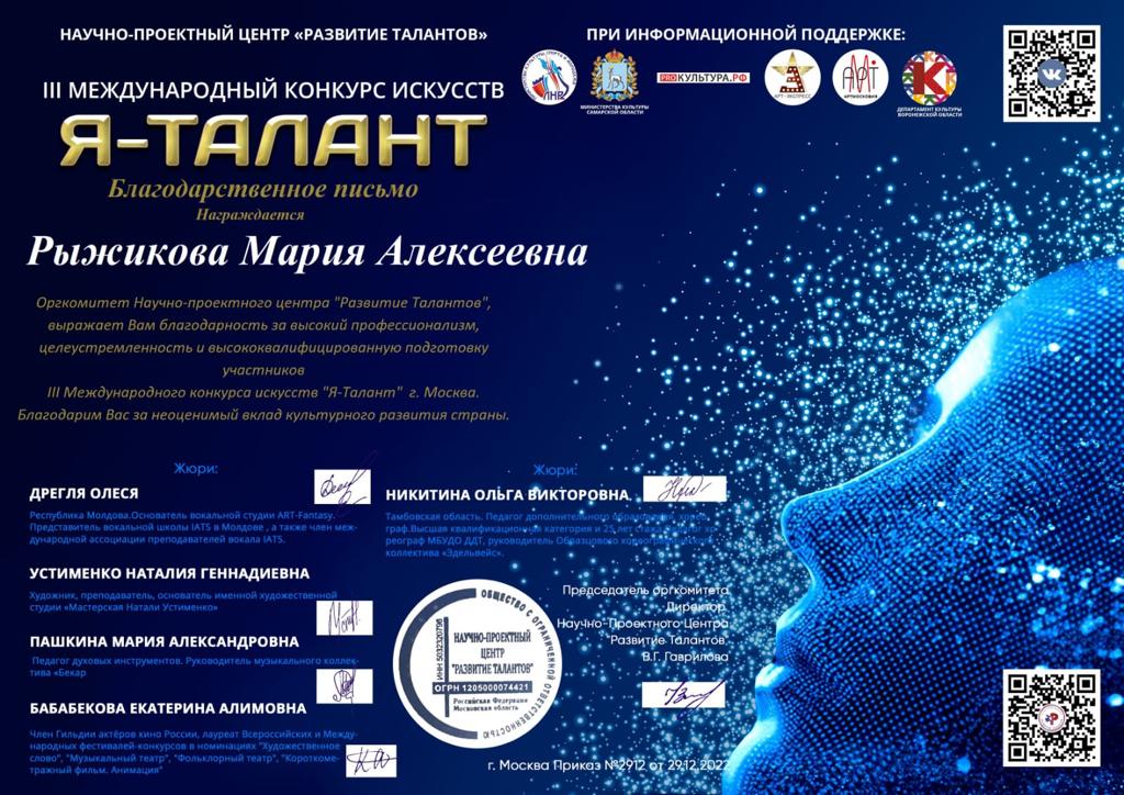 Выражаем огромную благодарность руководителю Рыжиковой Марии Алексеевне! Желаем дальнейших побед!