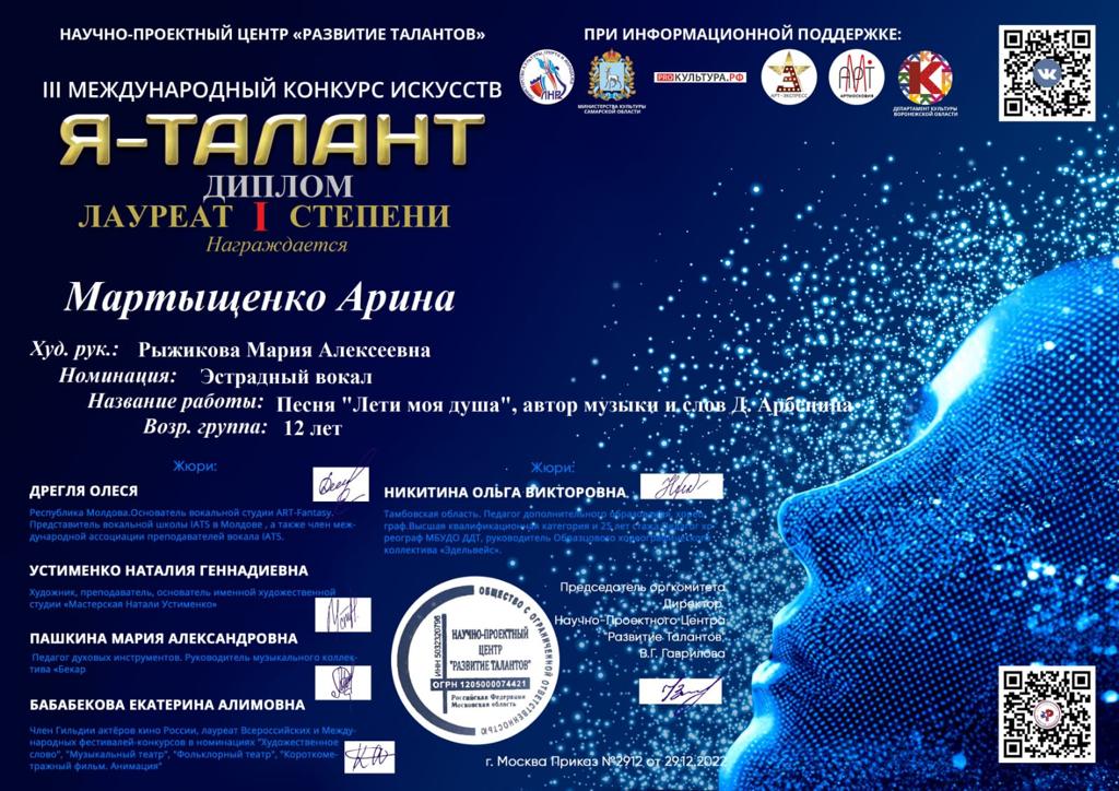 И, наконец, в Третьем международном конкурсе «Я талант», проводившемся при поддержке Министерства культуры РФ, Петриченко Софья и Мартыщенко Арина стали лауреатами первой степени.