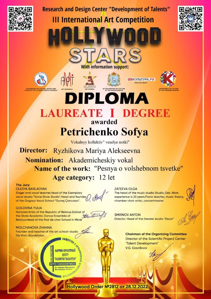 На III международном арт-фестивале HOLLYWOOD stars, организованном научно-проектным центром «Развитие талантов» (г. Санкт-Петербург), Мартыщенко Арина с конкурсной работой стала лауреатом II степени, а Петриченко Софья заняла первое место.
