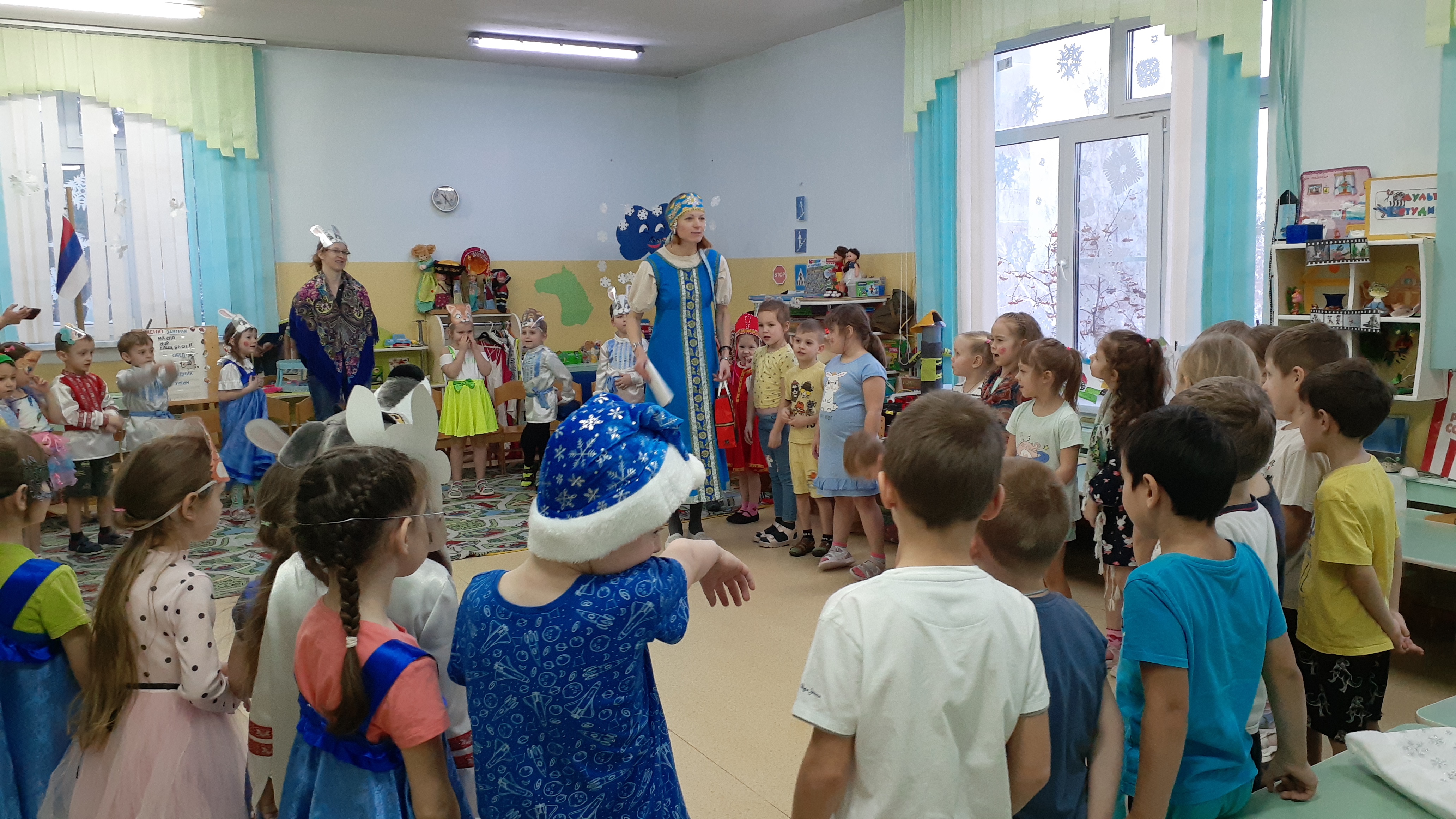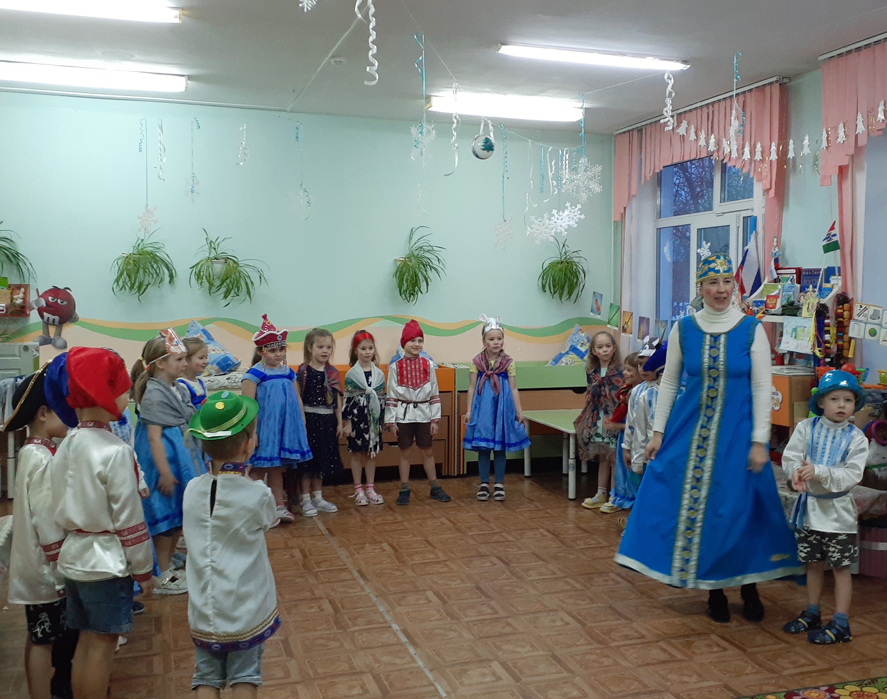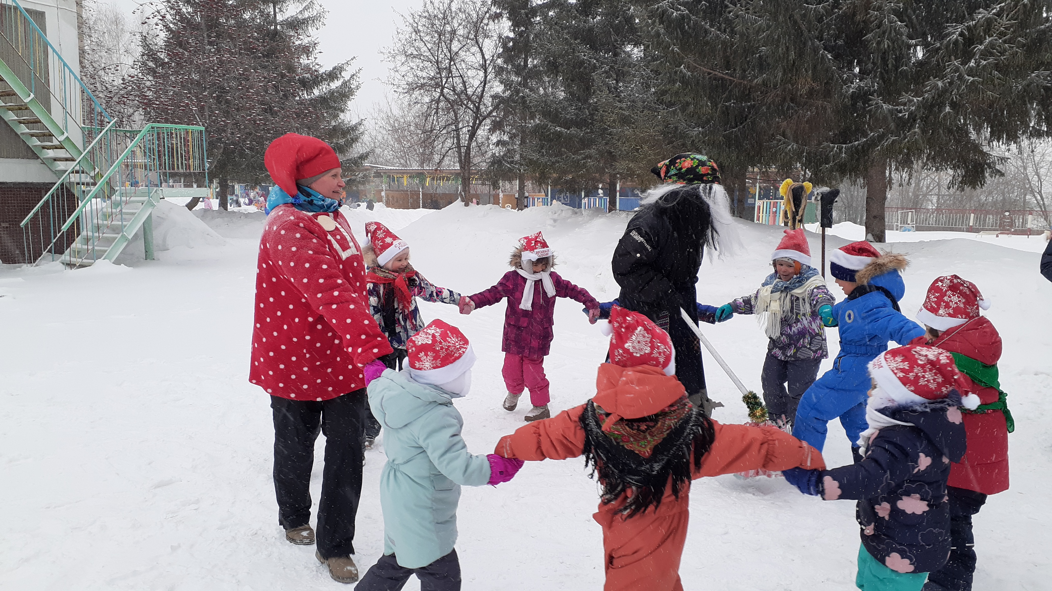 Также и у нас в детском саду воспитанники ходили друг к другу в гости по группам, пели колядки и плясали. Под русскую народную мелодию ряженые воспитанники заходили в группы, осыпали зрителей зерном, водили хороводы. Проводись весёлые игры, дети пели колядки. Для игры «Валенок» дети вставали в круг и под музыку передавали валенок, украшенный бантом. У кого после окончания музыки валенок остался в руках, тому загадывали загадку про зиму. После игры проводилось гадание по профессии: в мешочке лежали предметы – книжка, музыкальный инструмент, краски, машина и т. д. По предмету определяли, кем станет ребёнок в будущем. Например, машина – водитель, мел – учитель, кукла – воспитатель. Всем было очень весело! После игр, плясок, колядок воспитанники группы одарили сладкими угощениями ряженых гостей.