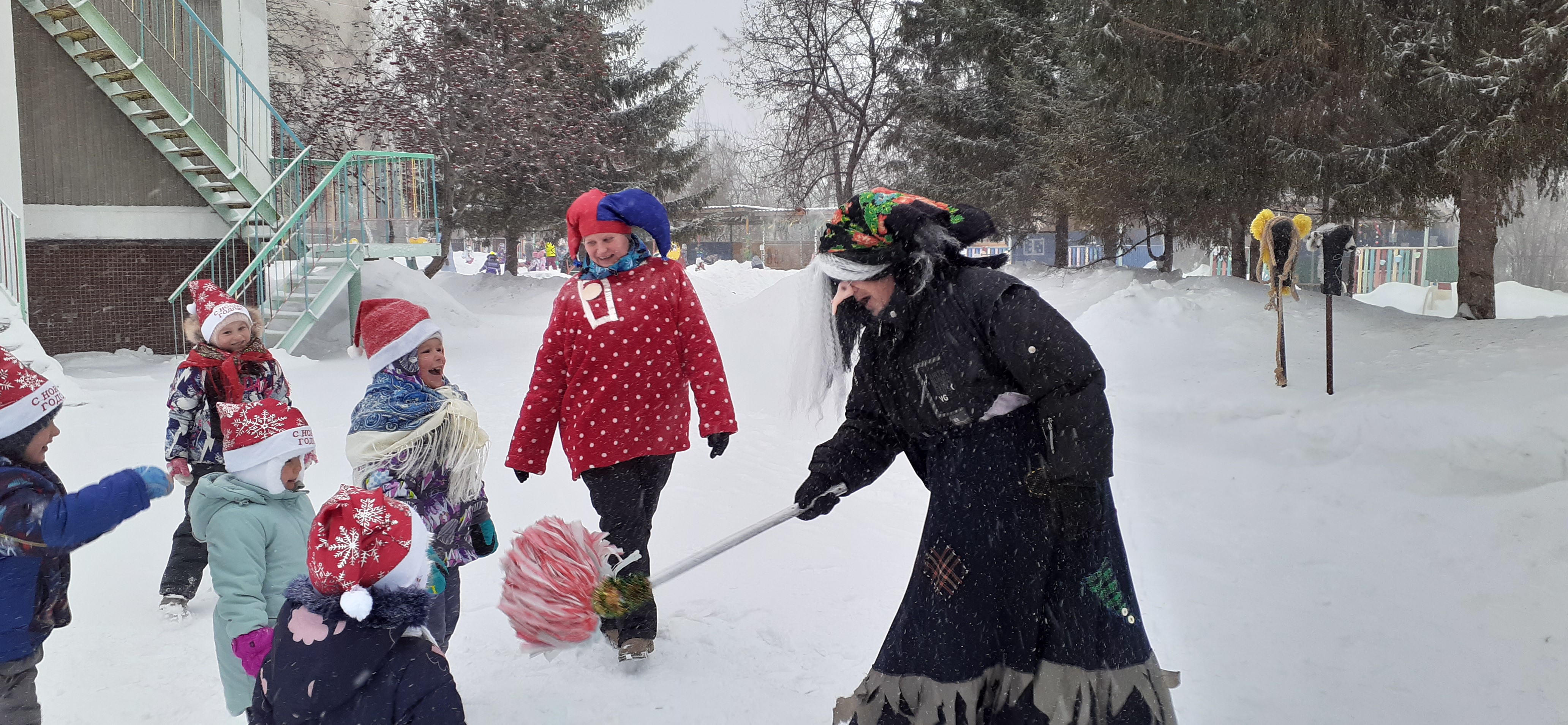 В начале рождественского забега дети поиграли с петрушкой в хороводные игры. Потом появилась Баба Яга, она удивилась, что дети на лыжне, и предложила посоревноваться. Дети вместе с Бабой Ягой весело и задорно прошли два круга на лыжах. Ребята продемонстрировали хорошую технику лыжного хода! После лыжного забега дети с Бабой Ягой перетягивали канат, водили хоровод, играли в народную игру «Золотые ворота». После весёлых колядок Баба Яга угостила ребят угощением.