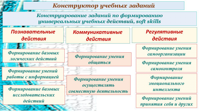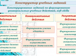 Педагоги проанализировали основные требования к разработке заданий по формированию универсальных учебных действий. В малых группах обсуждались варианты построения учебного задания, направленного на достижение метапредметных результатов. В ходе совместной деятельности педагоги использовали целенаправленно разработанный конструктор учебных заданий.