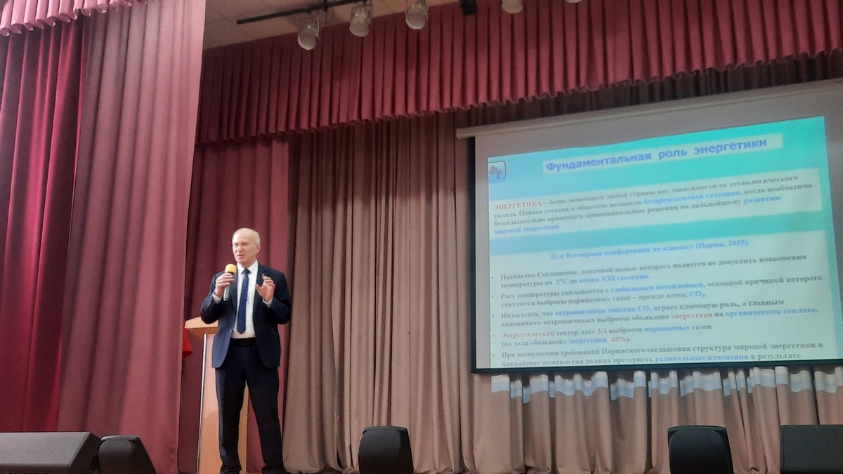 Сергей Владимирович Алексеенко, доктор физико-математических наук, профессор, академик РАН, специалист в области теплофизики, энергетики и энергосбережения, научный руководитель Института теплофизики СО РАН, прочитал лекцию «Глобальное потепление и энергетика» для учащихся 8-11 классов. Старшеклассники погрузились в проблемы и перспективы энергетики, решение проблем, связанных с глобальным потеплением; задавали вопросы и активно включались в дискуссию о перспективах развития альтернативной энергетики.