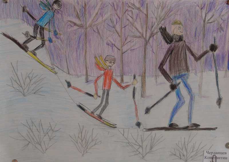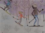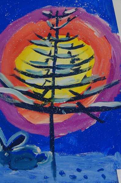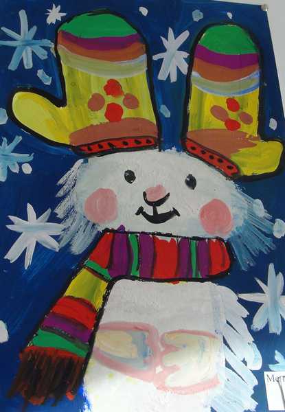 На ярком легковом автомобильчике с номером «Заяц» над бампером едет по лесу в красном колпаке жизнерадостный Косой. Здесь же в лесу беленькая кошечка с большими лучистыми глазами и три дружных Снеговика вышли погулять, взявшись за руки. Елка на фоне большой радужной Луны вносит свою яркую мелодию. Атмосфера уютного зимнего леса, населенного деловыми зверюшками, умиляет и радует зрителей. Городские жители тоже не скучают на рисунках детей – катаются на лыжах и коньках, приглашая и нас последовать их примеру.