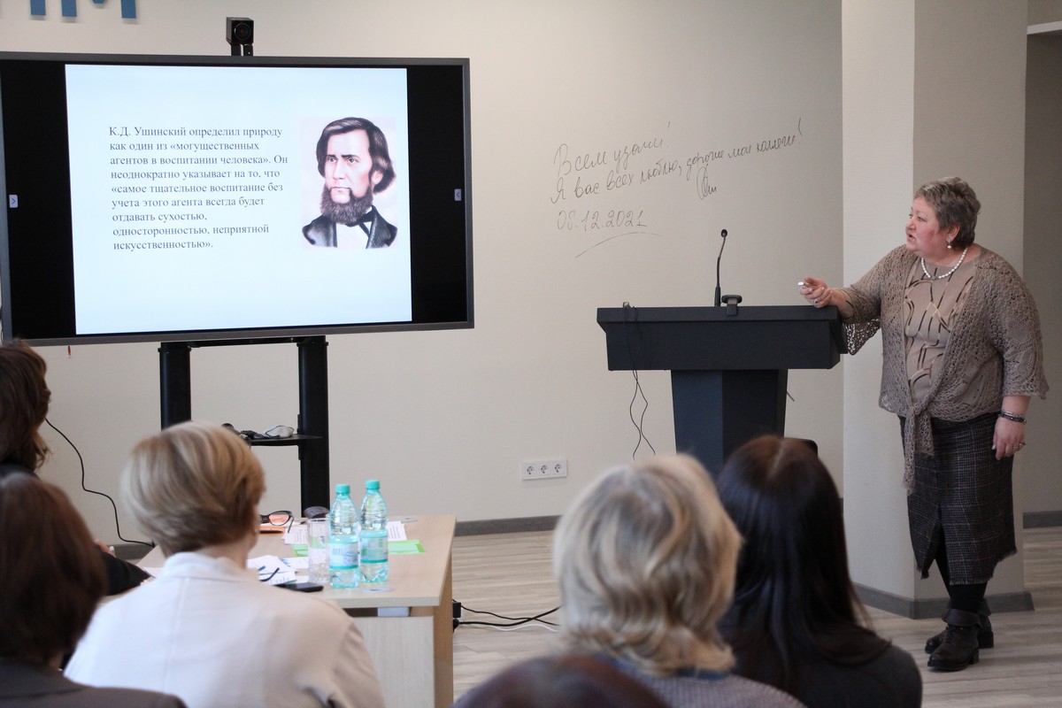 С приветственным словом к участникам обратились Любовь Васильевна Третьякова, директор ДДТ им. В. Дубинина, и Наталья Николаевна Малахова, зав. кафедрой педагогики, воспитания и дополнительного образования. На пленарной части Леонид Иванович Боровиков, профессор кафедры педагогики, воспитания и дополнительного образования, выступил с докладом «Авторская реинтерпретация собственных представлений о народности в хронологически фиксируемой ретроспективе». Лариса Викторовна Черникова, доцент кафедры педагогики, воспитания и дополнительного образования, обратилась к педагогам с докладом «Интерпретация отечественного воспитательного опыта в аспекте антропологической теории К. Д. Ушинского». «Сохранение и развитие традиций Русской классической школы в современном образовании» – тема доклада Анны Сергеевны Ивановой, учителя английского языка и словесности, и Марины Александровны Романовой, руководителя учебного центра Русской классической Школы.