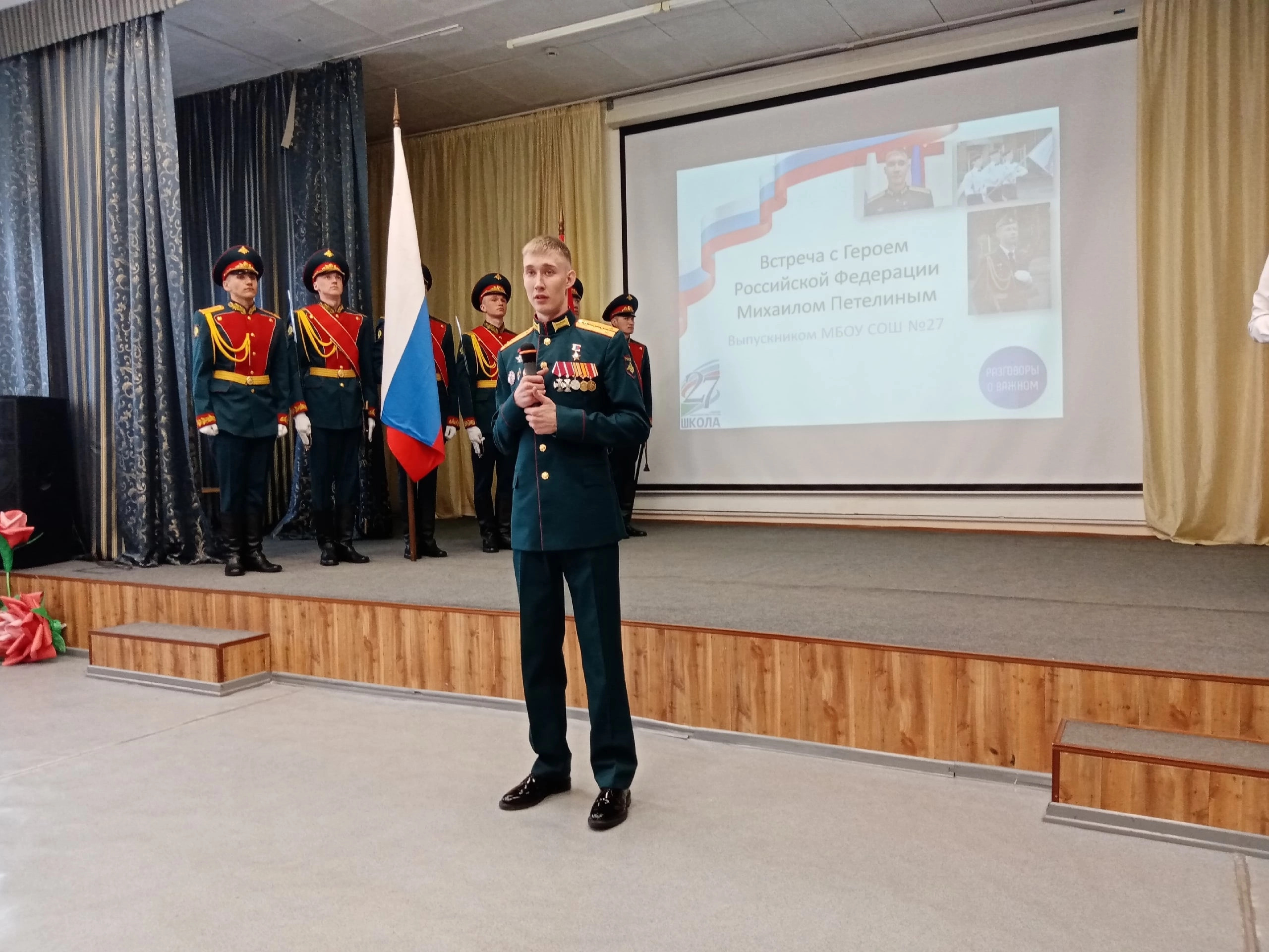 10 апреля в МБОУ СОШ № 27 состоялась встреча с выпускником школы, Героем России Петелиным Михаилом Александровичем. За время участия в специальной военной операции Михаил Петелин дважды был ранен и награждён двумя Орденами Мужества.