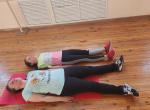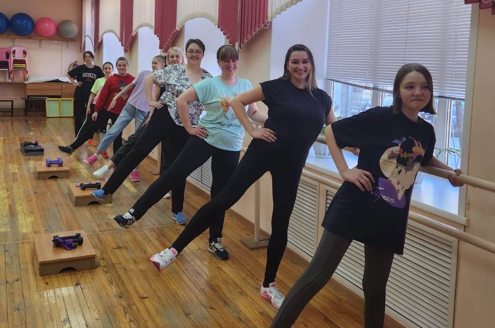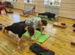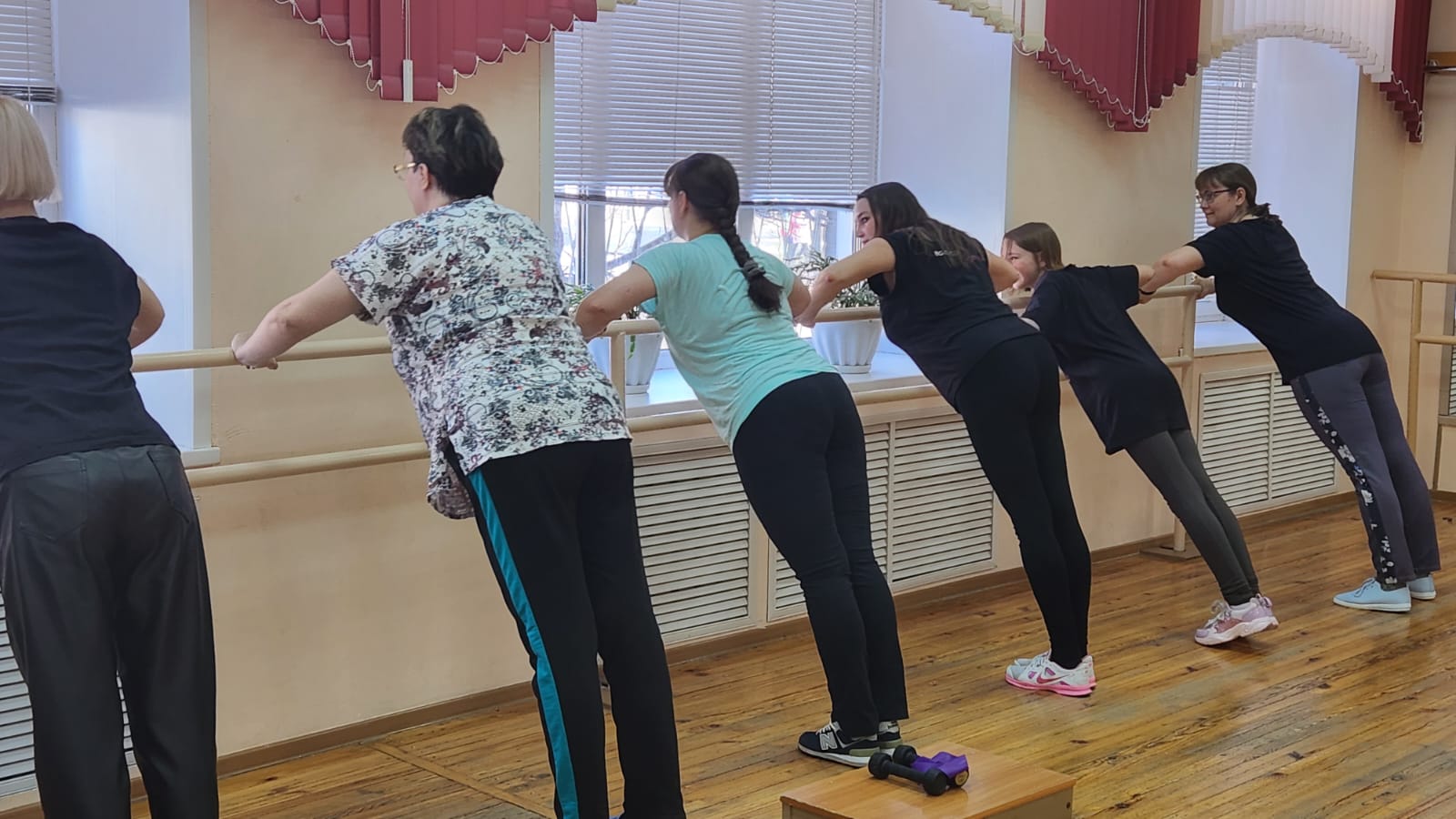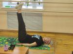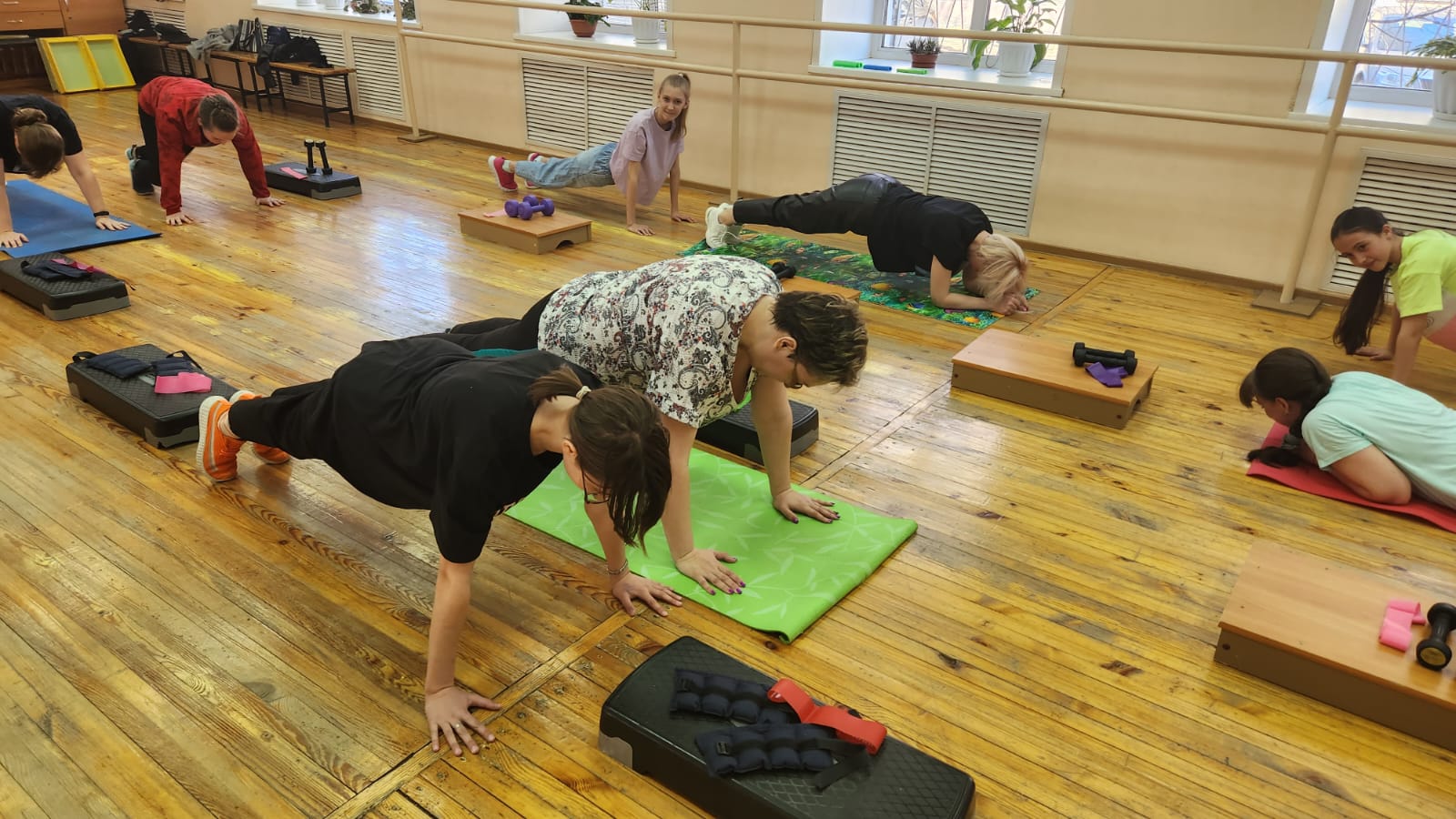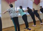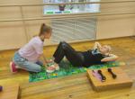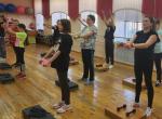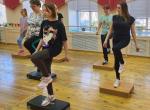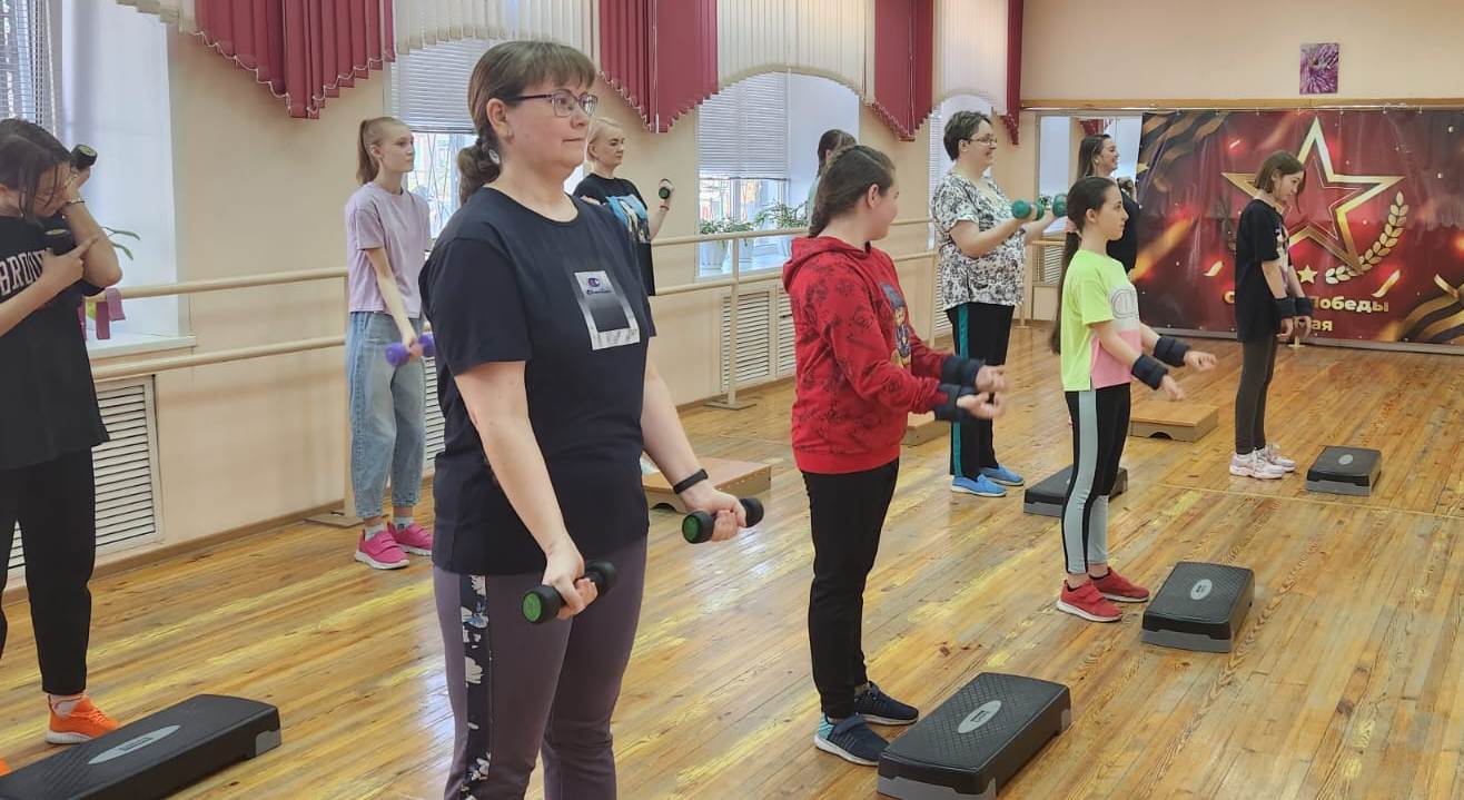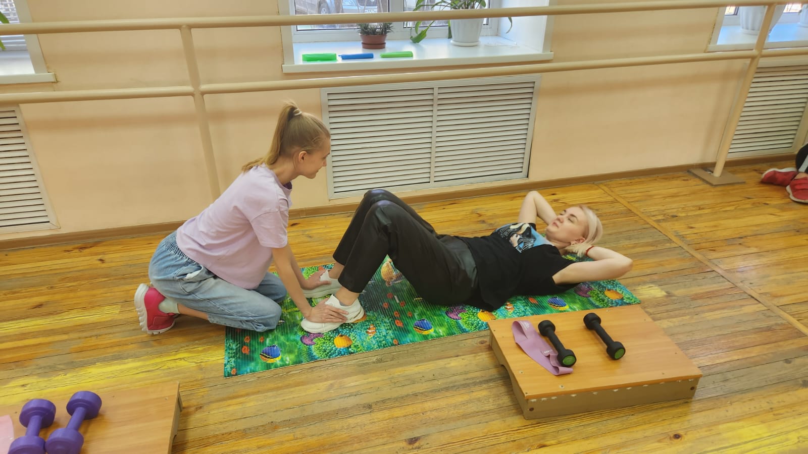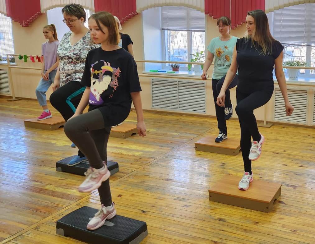 Мамы пришли в спортивной одежде, обуви, с ковриками, как и положено любителям аэробики. Занятие состояло из четырех частей: разминка, аэробная часть, силовые упражнения с гантелями и фитнес-резинками на ковриках для тренировки мышц пресса и спины и завершающая часть – стретчинг. На протяжении полутора часов девочки были в роли тренера-учителя. Поочередно показывали и разучивали движения, а мамам предстояло повторять за ними. Из полученных движений, а их было много, получилась танцевально-аэробная комбинация, которую в завершение первого блока должны были запомнить и показать все мамы, но уже самостоятельно.