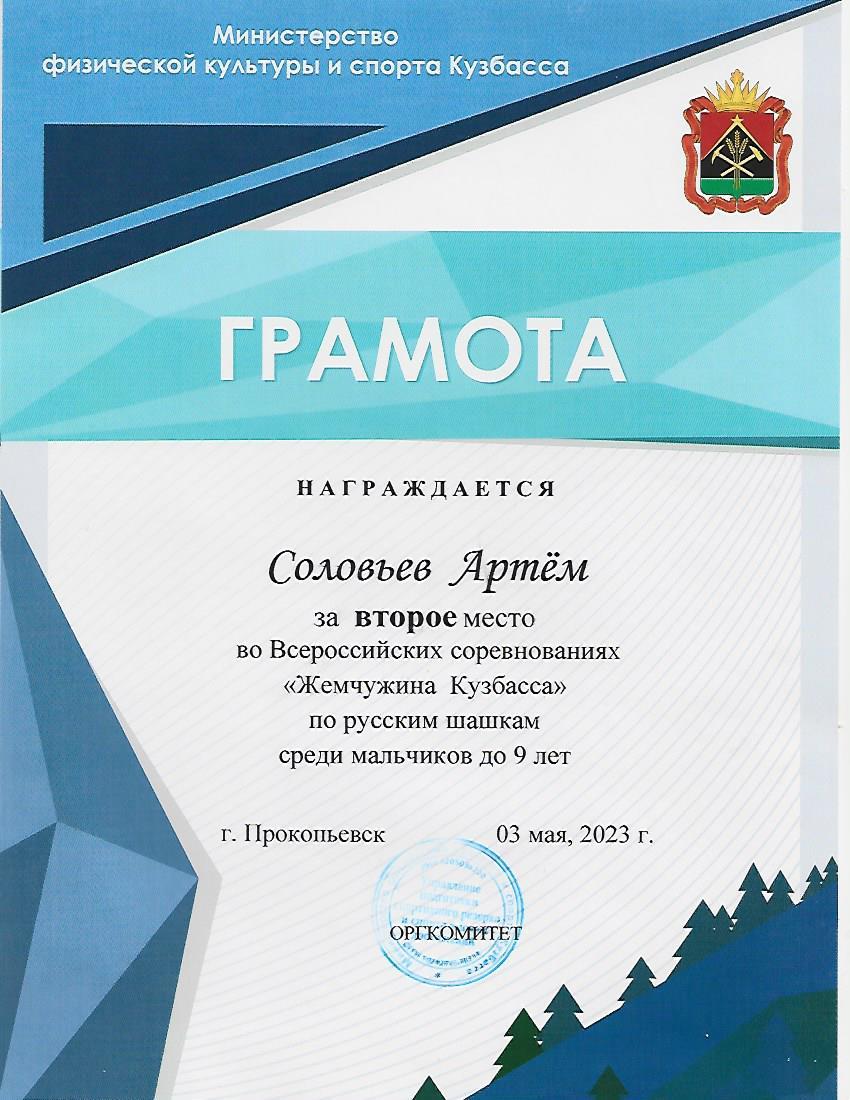С 26 апреля по 4 мая в городе Прокопьевске Кемеровской области прошли Всероссийские соревнования по русским шашкам «Жемчужина Кузбасса» среди мальчиков и девочек до 9 лет, юношей и девушек до 11, 14, 17 лет, юниоров и юниорок до 20 лет. В этом году впервые был организован также зачёт для мужчин и женщин.