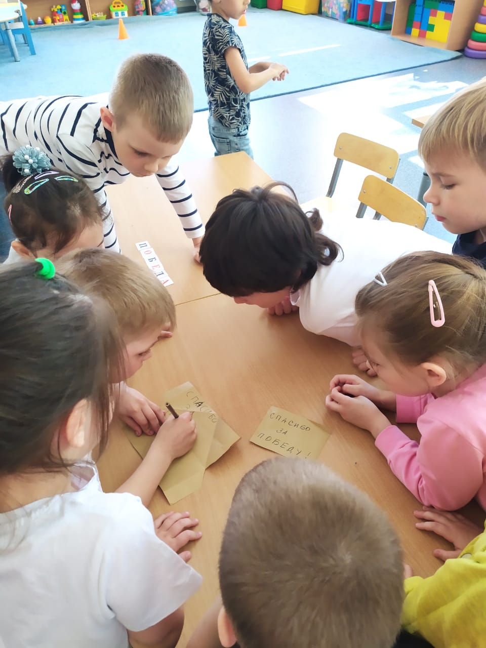 За каждое задание команды получили буквы, из которых позднее собрали слова Победа. Затем дети написали письмо благодарности ветеранам «Спасибо за Победу!».