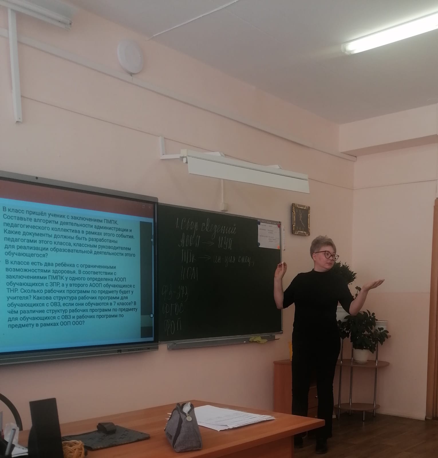 Групповая работа педагогов была направлена на обсуждение основных задач, принципов и направлений психолого-педагогического сопровождения обучающихся с ОВЗ. Также педагоги рассмотрели характерные особенности детей с ОВЗ различных нозологий и специфику методов и приемов работы с ними. В завершение педагогам было предложено решение педагогических кейсов.