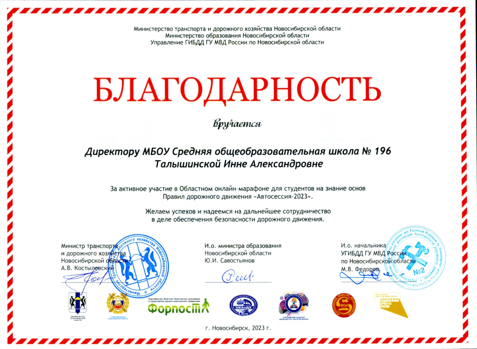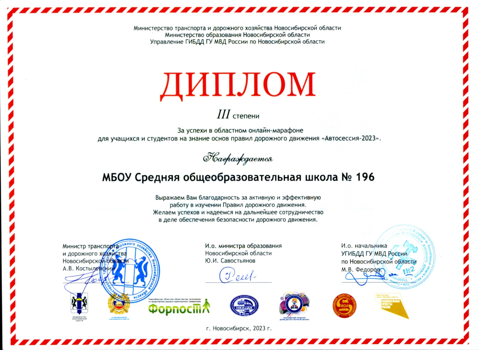 19 мая на торжественной линейке закрытия городского конкурса «Безопасное колесо – 2023 » присутствовали почетные гости и организаторы онлайн-марафона «Автосессия-2023»: заместитель начальника Управления Госавтоинспекции по Новосибирской области, полковник полиции Кузнецов Андрей Викторович, начальник отдела пропаганды безопасности дорожного движения Управления ГАИ Новосибирской области, майор полиции Варновская Анна Владимировна, начальник Госавтоинспекции города Новосибирска Мельников Роман Константинович, председатель Всероссийского общества автомобилистов Мун Григорий Алексеевич, заведующий отделением профессионального обучения Новосибирского автотранспортного колледжа и дорожного хозяйства Тардаскин Денис Васильевич, которые вручили дипломы и благодарности участникам онлайн-марафона «Автосессия-2023».