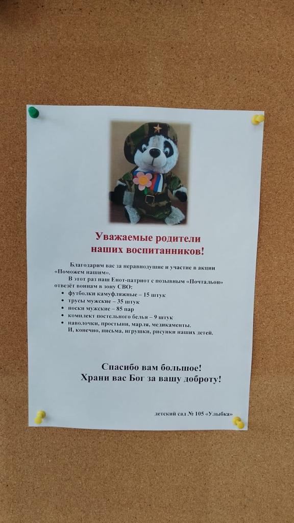 «Неугомонный!» – говорят о нашем еноте педагоги детского сада № 105 «Улыбка», ведь енот Цветочек – символ детского сада, которому дети присвоили позывной «Почтальон», снова побывал в зоне специальной военной операции. Вместе с руководителем волонтерской группы «Поможем нашим» Юлией Васильевой Цветочек передавал нашим воинам медикаменты, белье, и, конечно, письма, игрушки и рисунки от детей не только нашего детского сада, но еще и ДОУ № 430 «Сказка», который присоединился к волонтерскому движению.