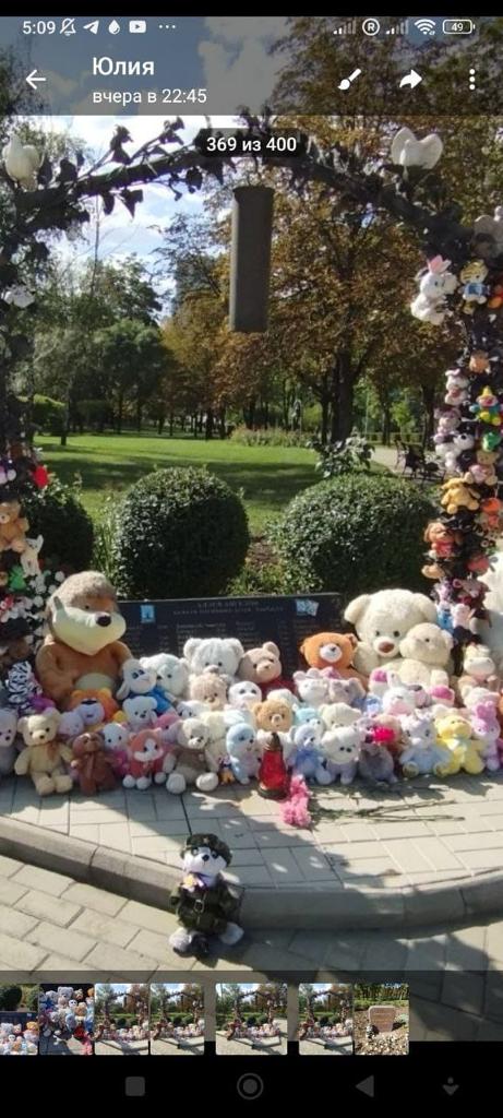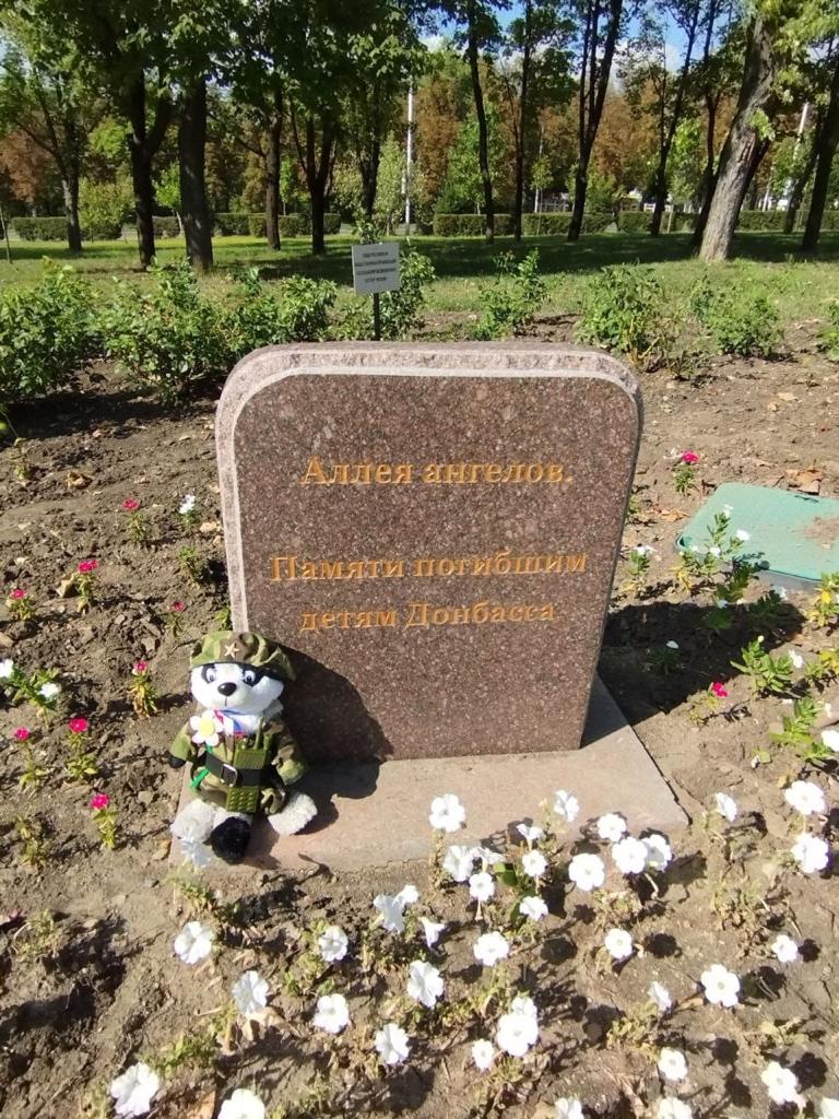 Побывал Цветочек на Аллее Ангелов, посвященной памяти погибшим детям, в Донецке: месте страшном по сути! Здесь идеальный порядок и чистота, сюда несут игрушки, теперь здесь стоит и скромный енотик из Новосибирска. Такой же энергетикой заряжен и мемориальный комплекс Саур – могила – памятник героической истории Великой Отечественной войны, знаковое место. Встретили воинов с Урала, обрадовались встрече. Юля с Цветочком подарили им знамя Победы. Музей «Молодая гвардия» в Краснодоне поразил своими масштабами. Здесь Цветочек познакомился с удивительной женщиной: директором музея Натальей Ивановной. Узнав от Юлии нехитрую историю енота из далекой Сибири, она была очень тронута тем, как незатейливо погружены в эту тему дети, и пообещала разместить информацию о нем в новой экспозиции музея. Всякий раз получая весточку с Украины, мы рассказываем детям, где сейчас Цветочек, с кем встречался, показываем фотографии.