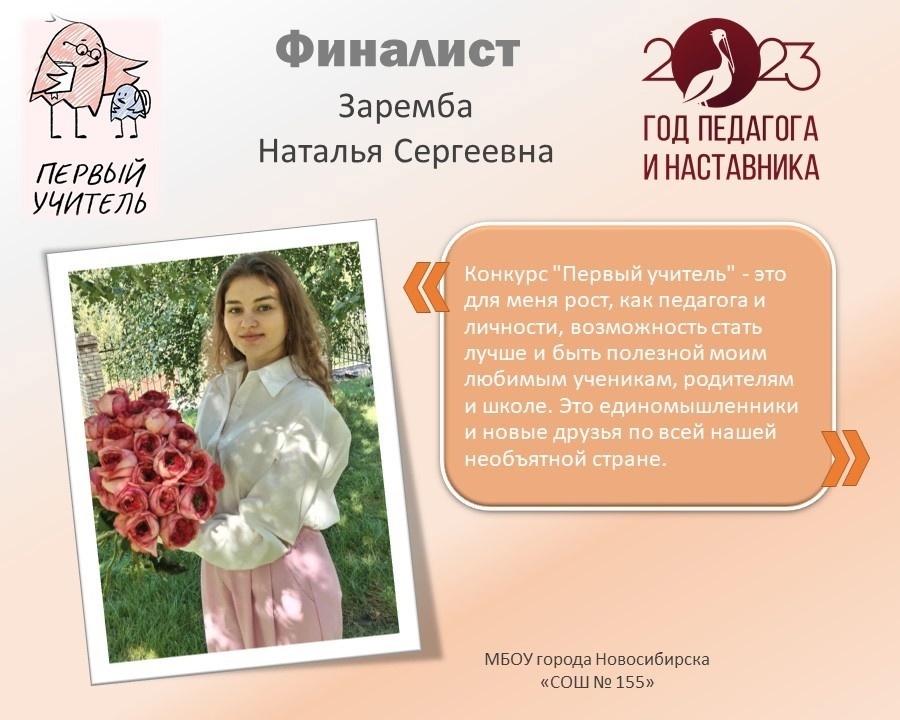 Всего на участие в конкурсе «Первый учитель» поступило свыше 15 тысяч заявок. В финал прошли 30 участников из Москвы, Санкт-Петербурга, Донецкой Народной Республики, Алтайского, Краснодарского краев Амурской, Иркутской, Липецкой, Московской, Новосибирской, Рязанской, Саратовской, Сахалинской, Свердловской, Тверской, Тюменской, Челябинской, Ярославской областей, а также Республики Татарстан, Ханты-Мансийского Автономного округа - Югры и Чеченской Республики. Одна из финалисток – преподаватель школы №1 г. Нефтеюганска Ханты-Мансийского автономного округа – по состоянию здоровья приостановила свое участие в конкурсе, по решению Оргкомитета она сможет принять участие в финальных испытаниях в следующем году. Новосибирск в финале представляет учитель начальных классов МБОУ СОШ № 155 Заремба Наталья Сергеевна.
