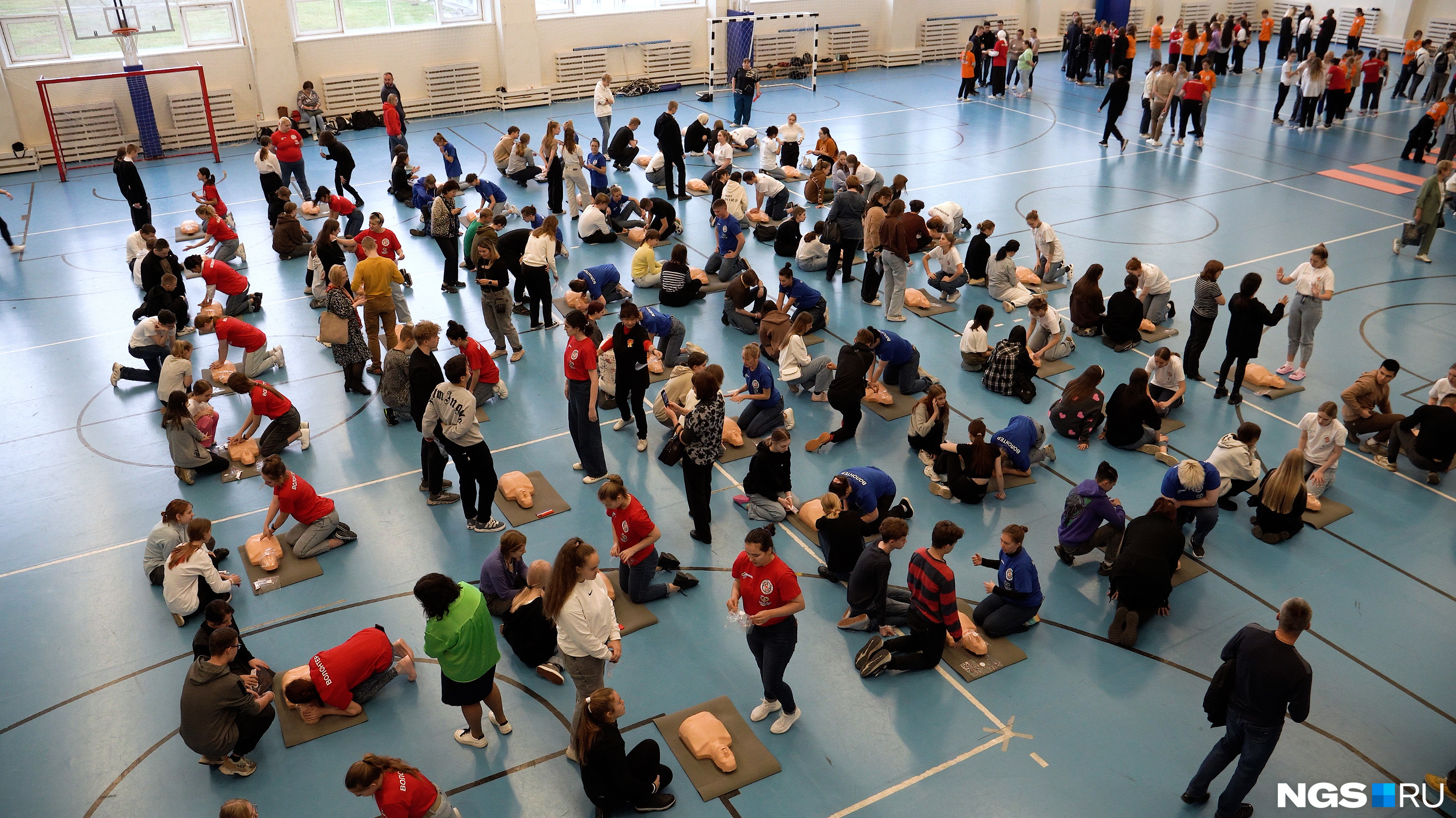 В огромной спортивном зале разместили 50 манекенов, на которых учили школьников правильно оказывать сердечно-легочную реанимацию. Всего мероприятие собрало 300 школьников.