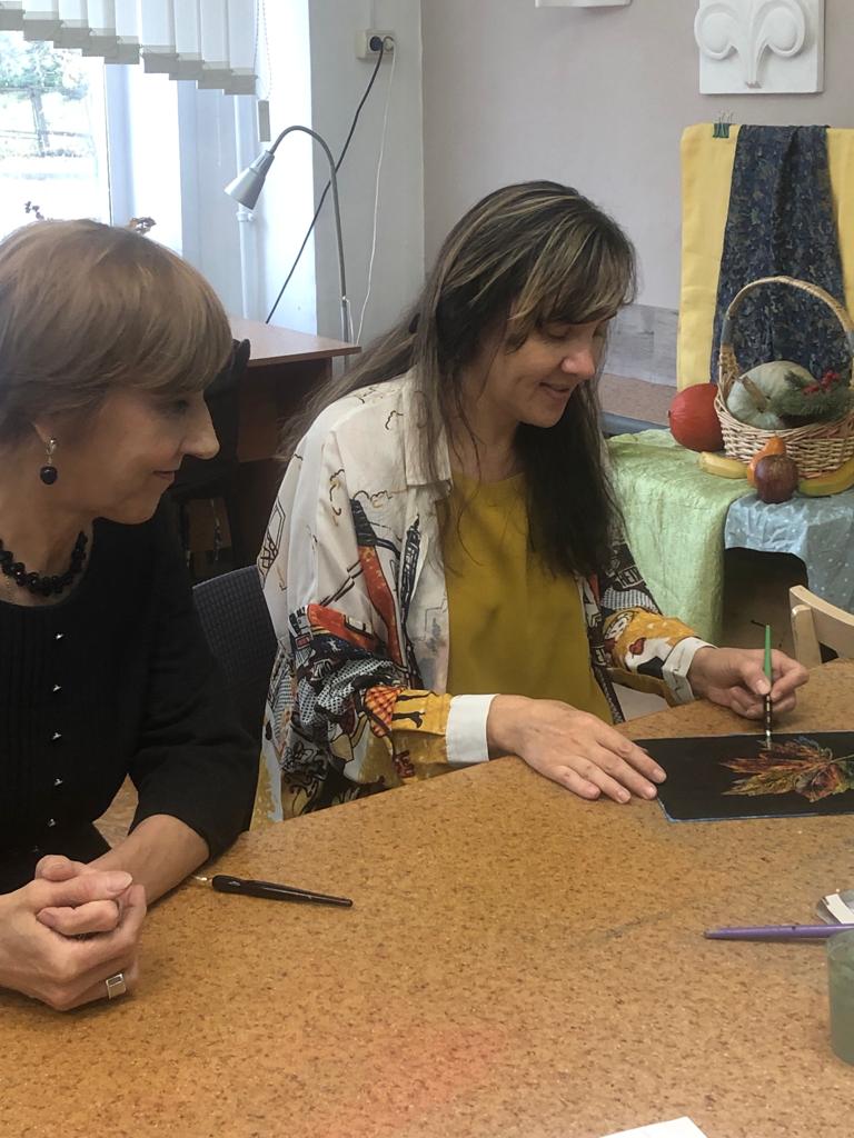 Техника «Граттаж» – это способ выполнения рисунка процарапыванием пером или острым инструментом. Марина Глебовна сначала познакомила участников мероприятия с технологией и необходимыми для такого вида творчества материалами. Затем все приступили к творческому процессу. И сразу серый осенний мир заиграл яркими красками.