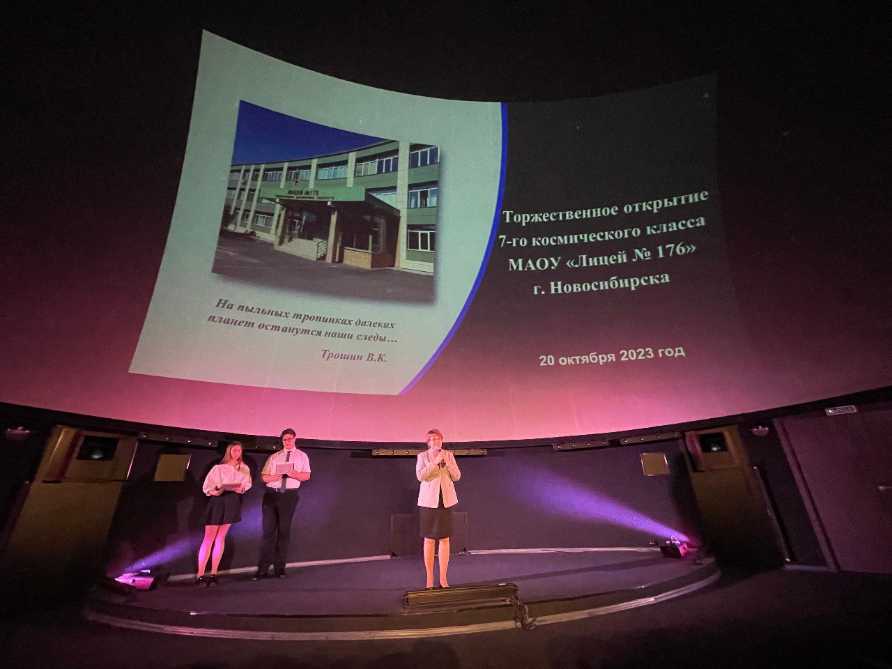 С приветственной речью к обучающимся, родителям и педагогам обратились Сутягина Валерия Ивановна, начальник управления общего и дополнительного образования департамента образования мэрии города Новосибирска; Плетнёва Елена Юрьевна, директор Новосибирского Института Современного образования; Белоусова Татьяна Анатольевна, директор Детско-юношеского центра «Планетарий» имени космонавта Анны Кикиной.