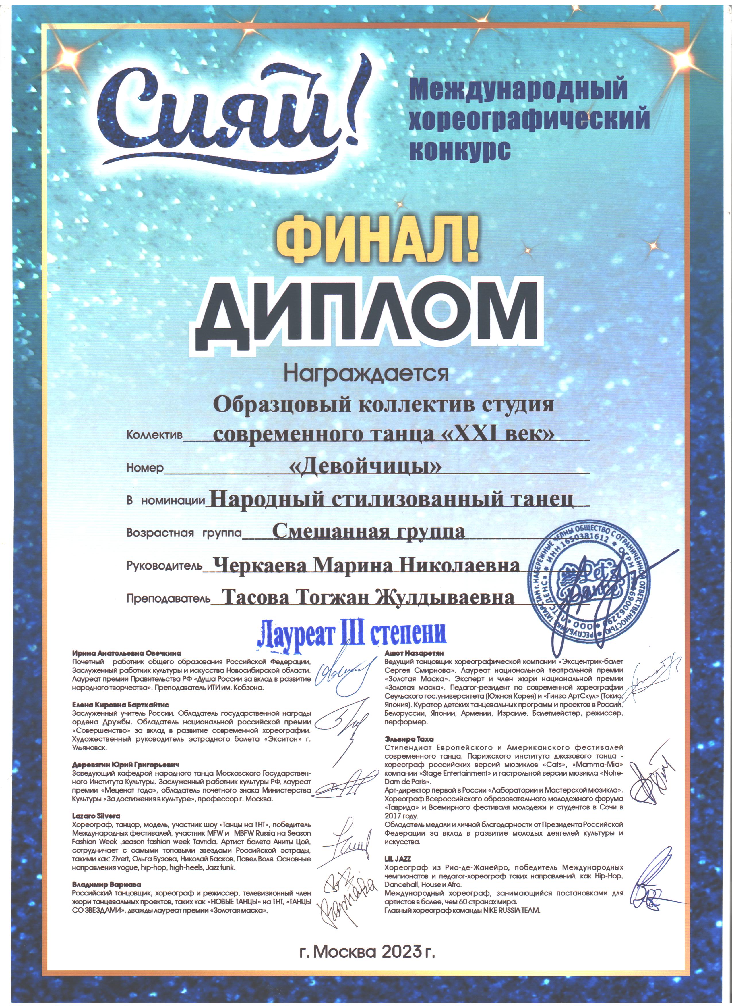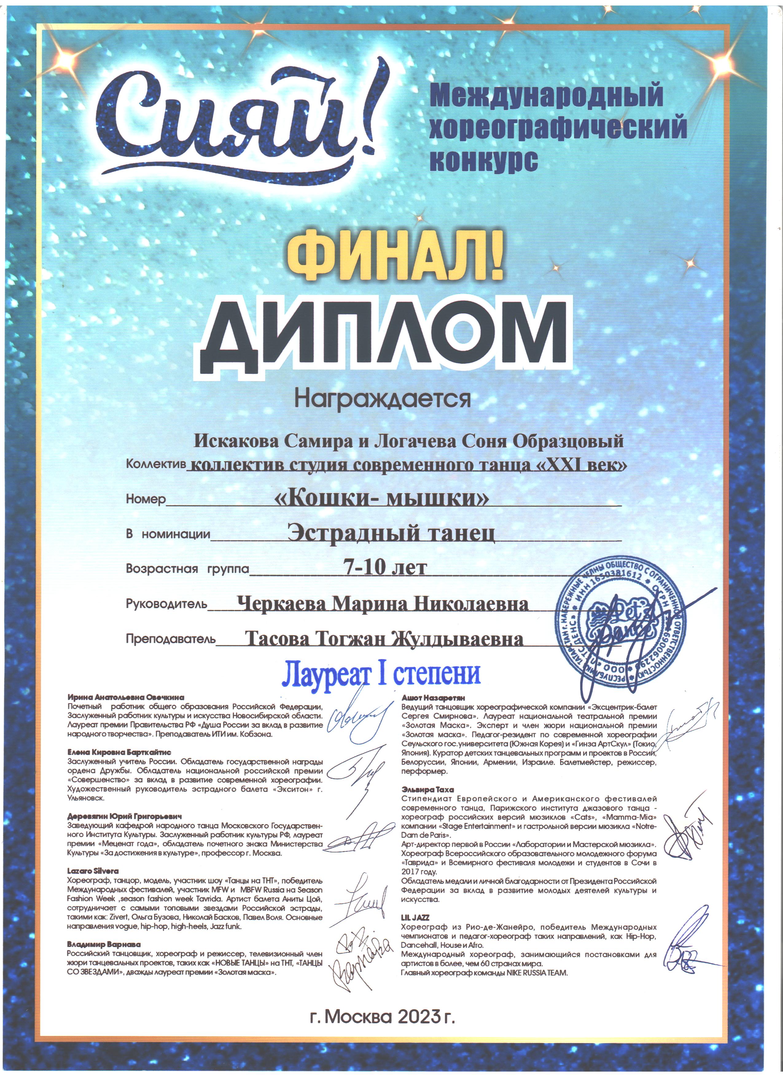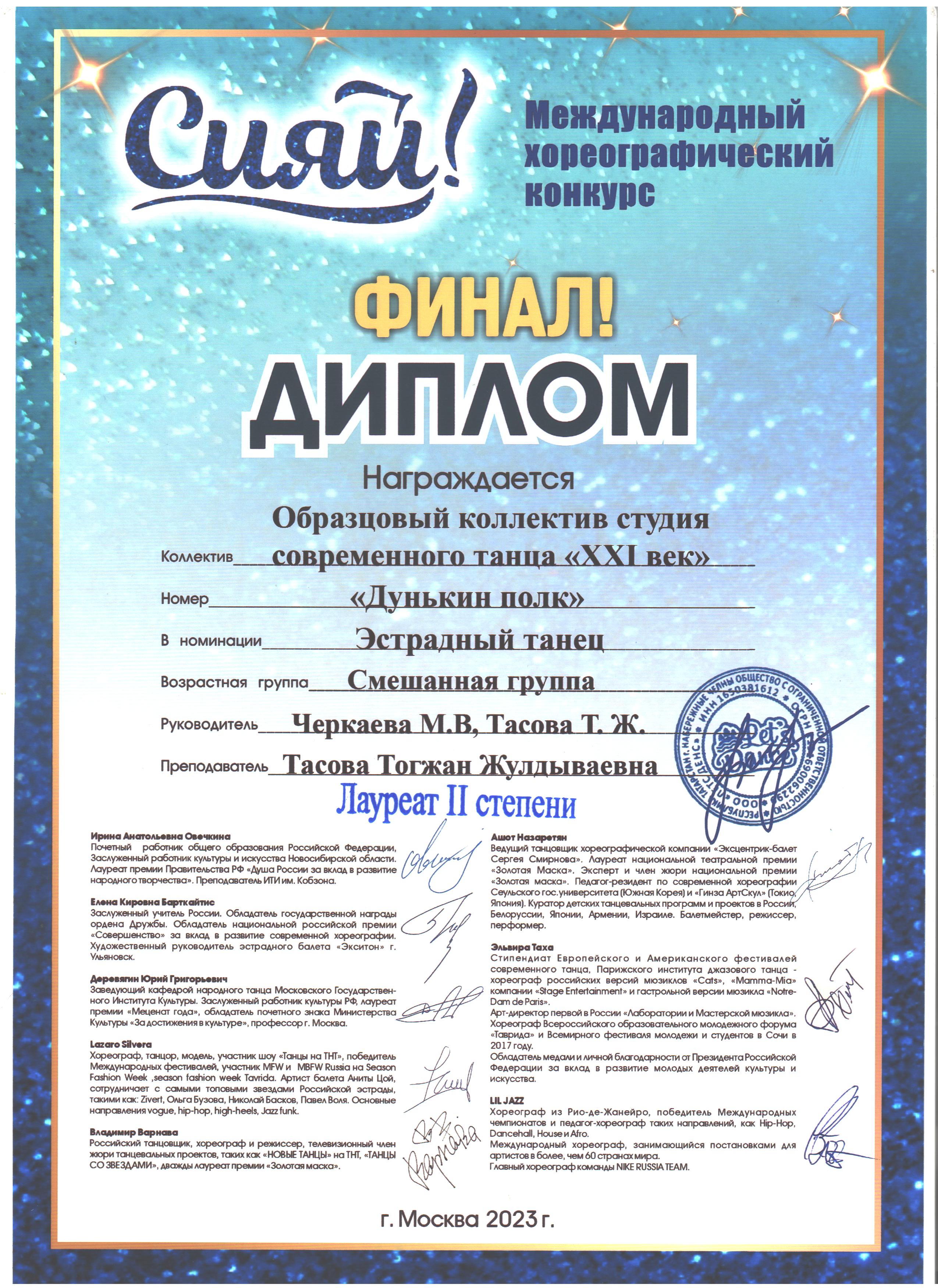 12 юных танцовщиков во главе с педагогами Черкаевой Мариной Николаевной и Тасовой Тогжан Жулдыбаевной успешно выступили в финале конкурса и заняли два вторых места. А самые маленькие воспитанницы с дуэтом «Кошки-мышки» стали победителями в своей возрастной категории и получили денежный приз 50000 рублей!