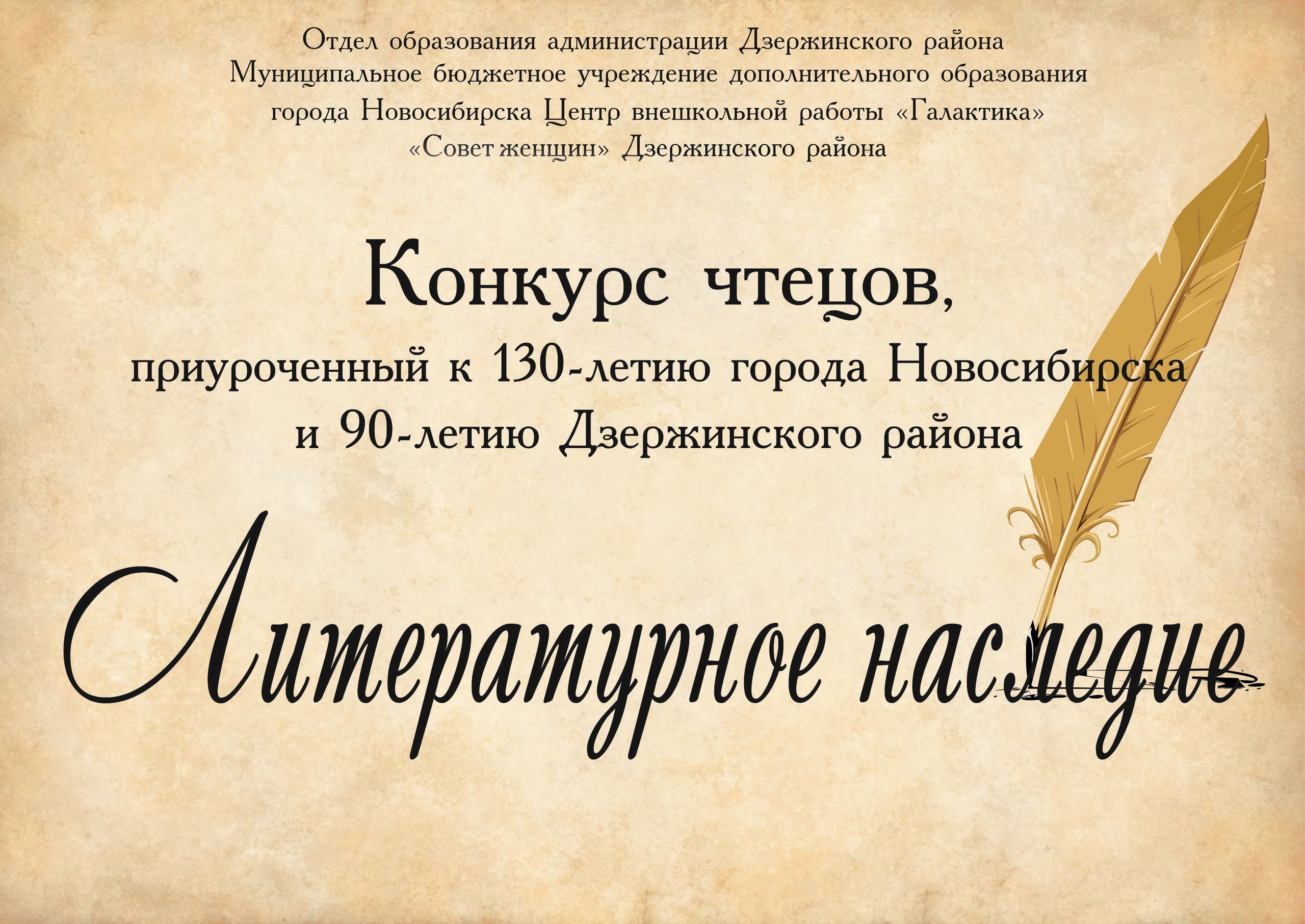 В ноябре 2023 года при поддержке отдела образования Дзержинского района города Новосибирска в МБУДО ЦВР «Галактика» был организован и проведен районный конкурс, посвященный 130-летию Новосибирска и 90-летию Дзержинского района «Литературное наследие».