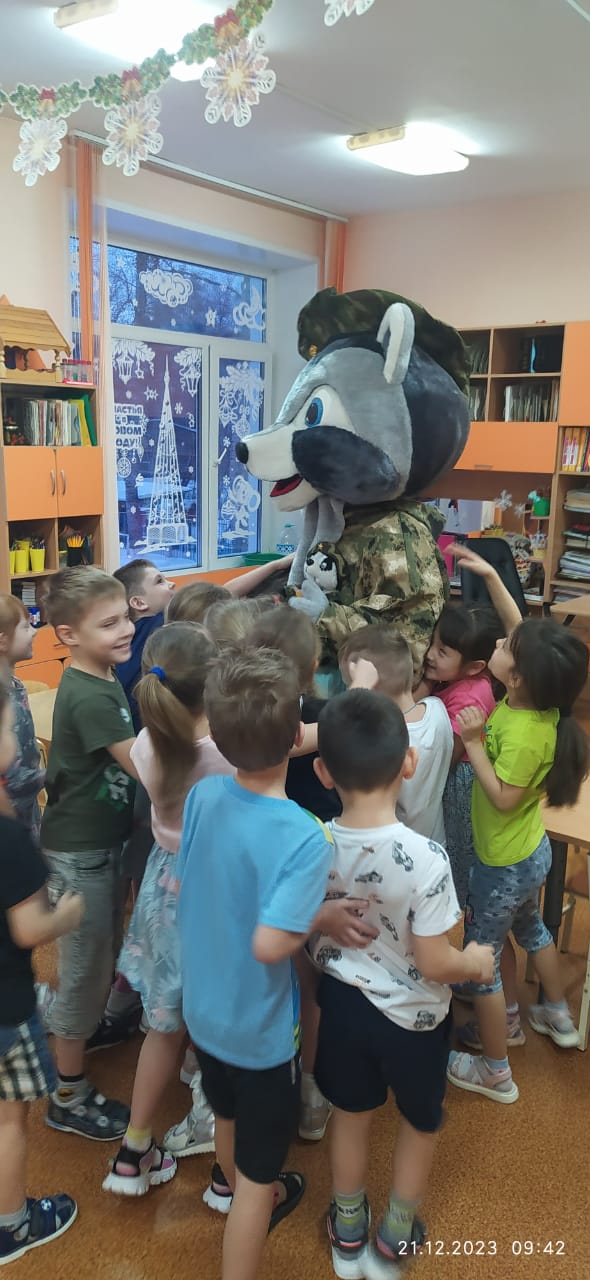 В преддверии наступающего Нового года наш большой Енот – Патриот пришел в группы, чтобы вручить от детского сада подарки ребятишкам, папы которых сейчас находятся «за ленточкой». Их только за последние три месяца у нас стало 9 человек. Надо было видеть, как обрадовались дети, и только маленькая Анечка из группы «Бусинка» сначала заплакала, испугавшись Енота, а потом залезла к нему на руки и никак не хотела уходить, только крепче прижимала к себе подарок. Не знаю, с чем это связано, но все наши воспитанники очень любят Енота, радуются, когда он приходит к ним в гости, скучают по нему. Вот и сейчас, когда Енот, попрощавшись, уходил из группы «Солнышко», малыши еще долго стояли у двери, махали и кричали: «До свиданья, Цветочек! Возвращайся скорей!».