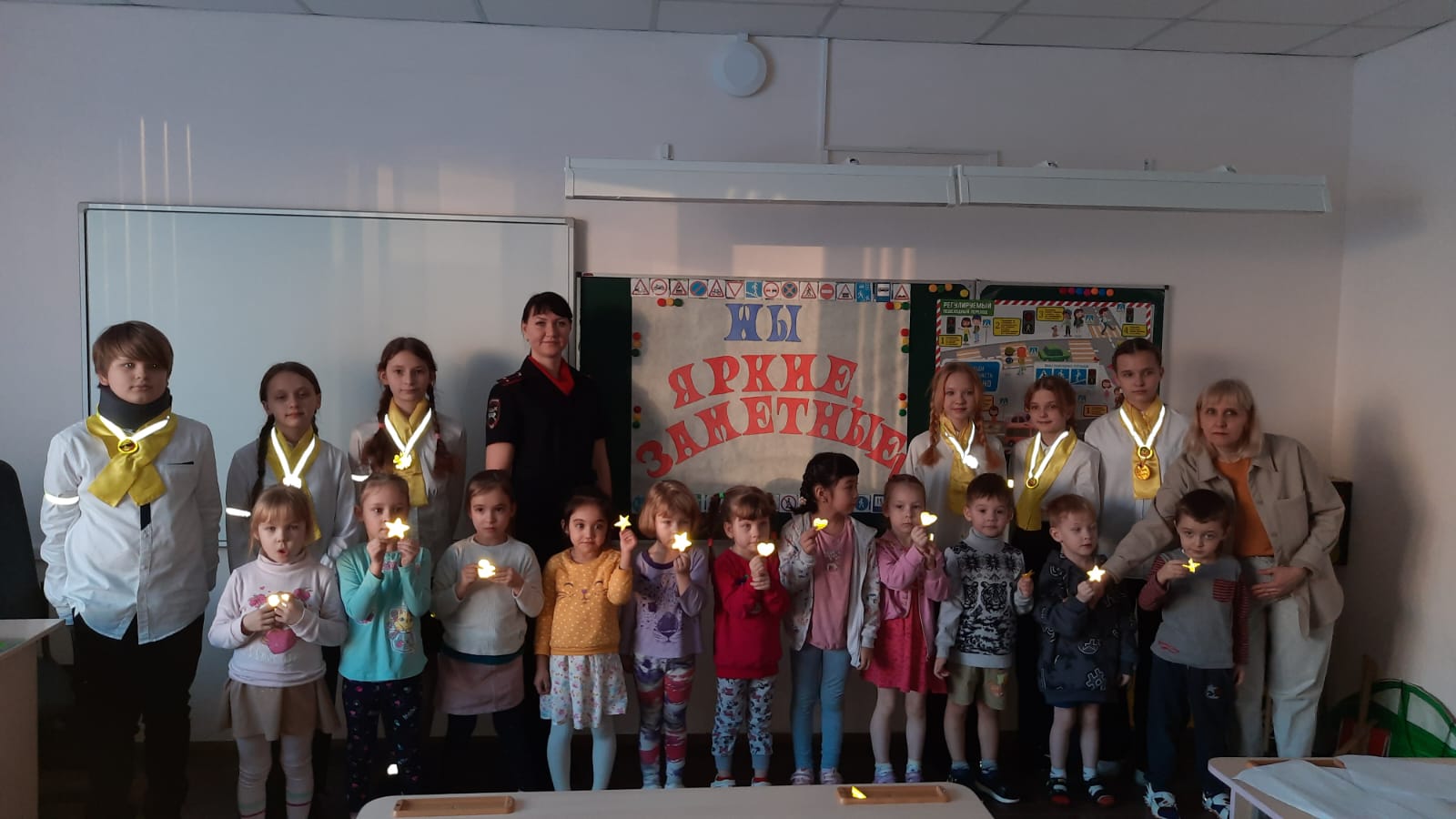 Любовь Николаевна рассказала о правильном и безопасном поведении на проезжей части. Объяснила дошкольникам, почему дети до семи лет должны ездить в автомобиле в детском кресле, зачем нужны светоотражающие элементы на одежде. И провела мастер-класс по изготовлению светоотражающих значков. Вместе с инспектором дети вспомнили основные правила пешеходов.