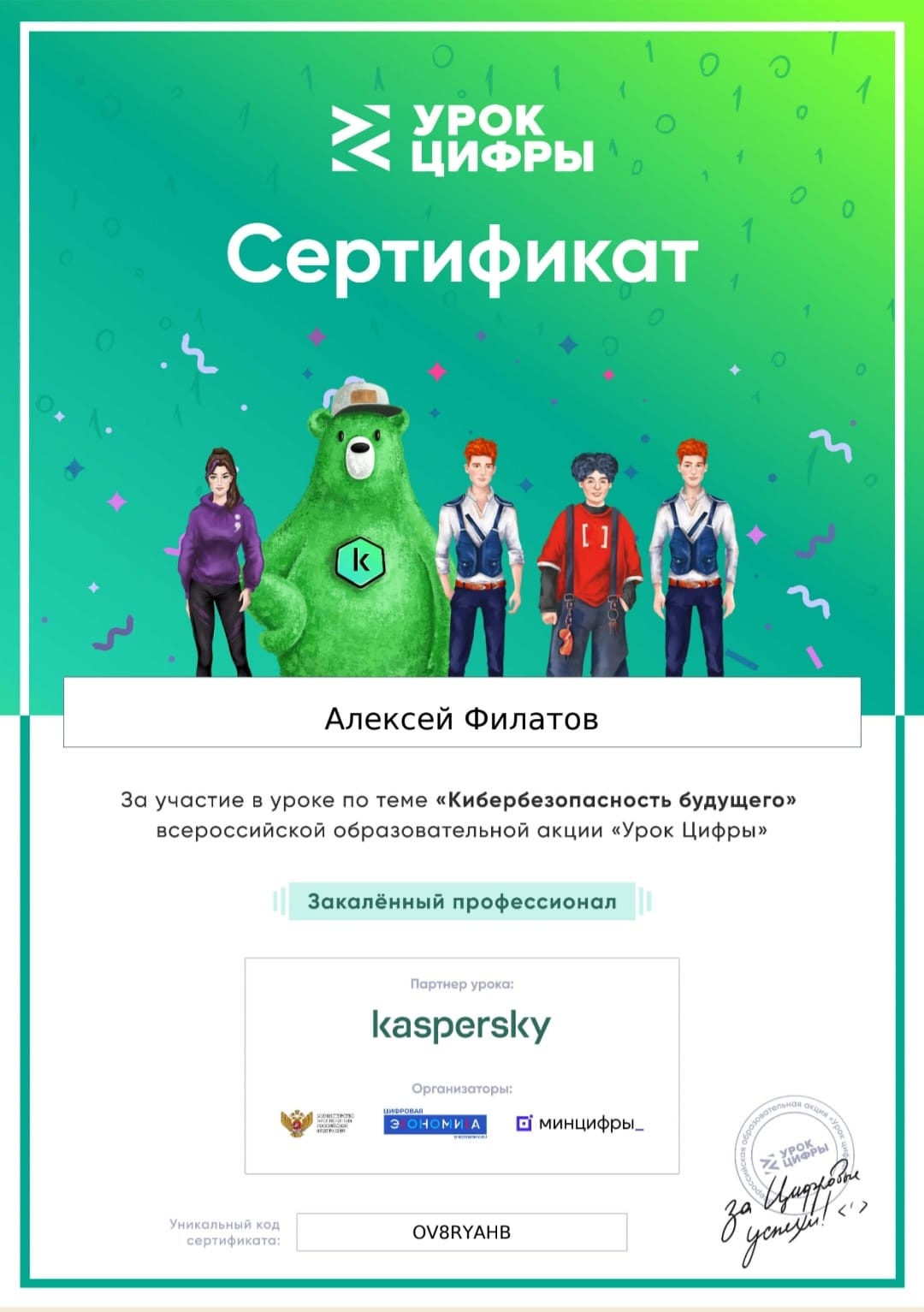 Посмотрев видеолекцию, обучающиеся отправились в будущее, чтобы обезопасить умный дом и умный город от кибератак. Ребята узнали о том, какие угрозы для умных устройств могут встретиться уже сейчас и как их предотвратить. Выполняя задания по кибербезопасности, участники урока познакомились с профессиями, которые обеспечивают безопасность использования электронных устройств. По окончании урока каждый участник стал обладателем сертификата с оценкой. Оценки оказались разными: среди них как «Начинающие испытатели», так и «Закалённые профессионалы».