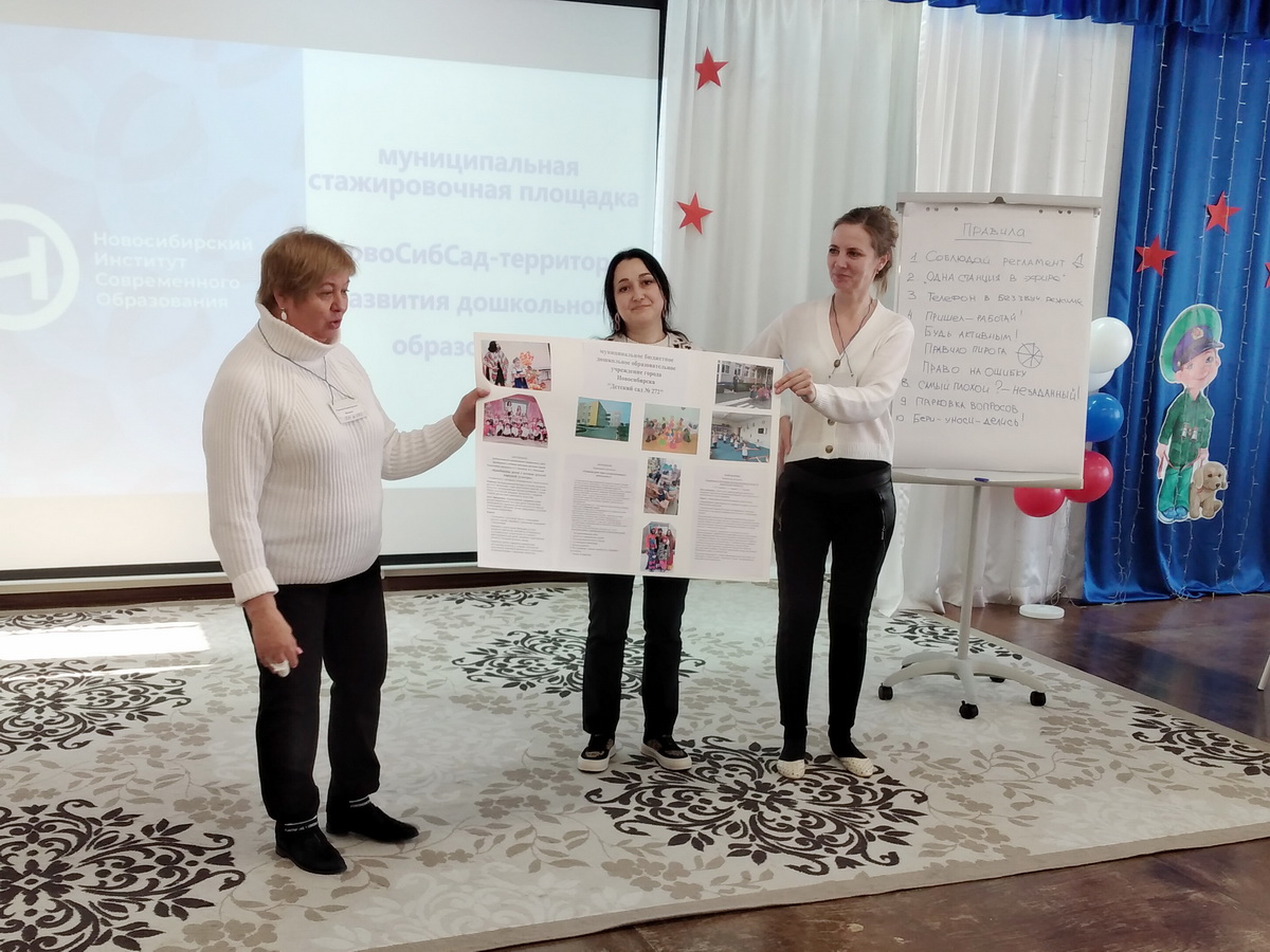 Мероприятие началось со знакомства: после обсуждения групповых правил и объединяющей игры, проведенной педагогами детского сада № 59, участники семинара представили первое домашнее задание – визитку детского сада с акцентом на направление деятельности своей стажировочной площадки. Куратор направлений «НовоСибСадСредаТретийПедагог» и «НовоСибСадСкоровШколу», старший методист МАУ ДПО «НИСО» Курбасова Татьяна Павловна познакомила педагогов с нормативными документами, регламентирующими работу стажировочных площадок.