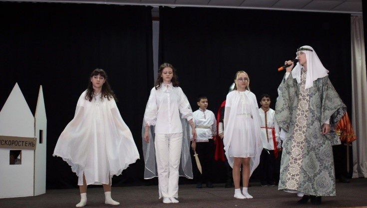 Силами учеников 6 «Г» класса присутствующим был показан фрагмент театральной постановки «Княгиня Ольга» по мотивам летописи «Повесть временных лет».
