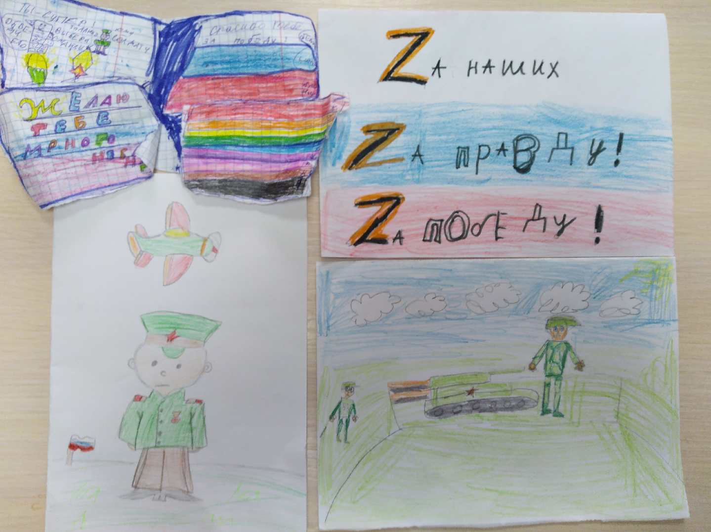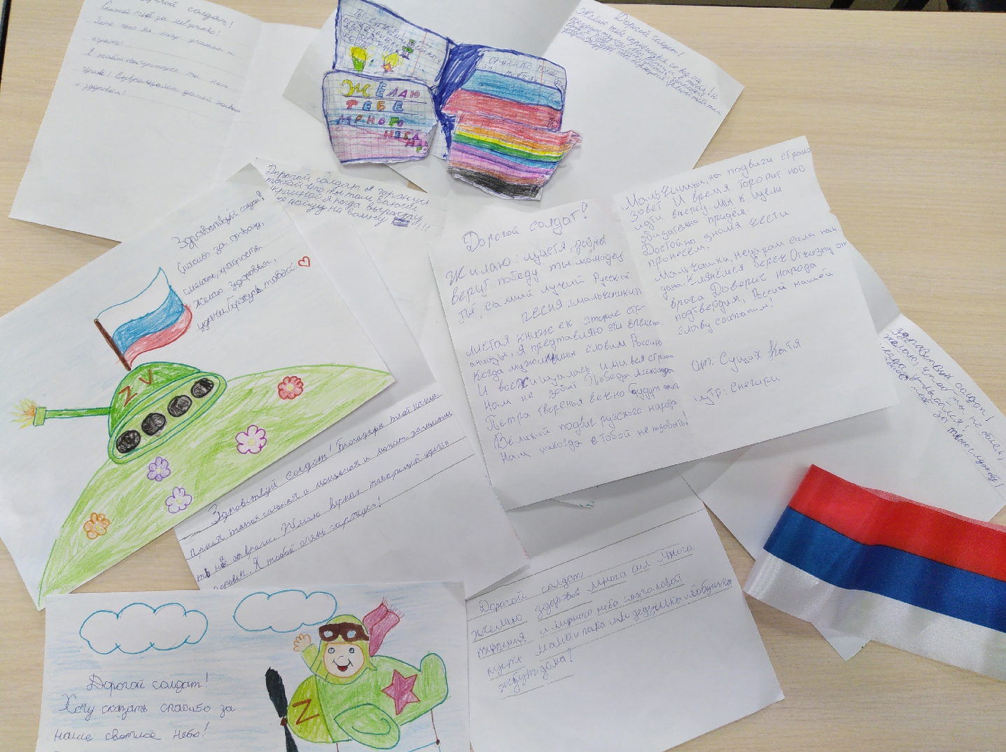 Ребята слушали с большим интересом, задавали серьезные вопросы. В диалоге была затронута тема помощи нашим солдатам, которая приходит из тыла. Письма с теплыми словами от земляков и посылки с родного края греют душу каждому военнослужащему, поддерживают их боевой дух. Это очень важное и нужное дело. Поэтому ребята принесли и вручили «Скифу» свои рисунки и письма для артиллеристов расчёта, где служит Дмитрий Владимирович Головня. Каждый из юных авторов рисунка лично подходил с пожеланиями победы и скорейшего возвращения! В завершение встречи звучала песня «Я – русский!» слова которой пели все вместе с флагами России в руках. Встреча получилась серьёзной, трогательной и необходимой для всех нас!