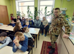Боец российской армии познакомился с ребятами, рассказал о себе, а также о том, как стал участником СВО. Он поделился опытом нелегкой, но доблестной службы на передовой при выполнении задач специальной военной операции под Кременной, в военной группировке «Центр» на краснолиманском направлении. Сейчас он находится в 20-дневном отпуске и вскоре отправляется на передовую уже во второй раз. Подростки с большим интересом слушали и задавали земляку вопросы про подвиги российских военнослужащих, помогают ли наши письма, поддерживают ли они наших воинов. У «Скифа» на бушлате шеврон: «Дивизион Моцарта», в память об их боевом командире с позывным «Моцарт». Ребята услышали о буднях на передовой, об участии в военных спецоперациях, о боевой работе расчётов гаубиц «МСТА-Б», о трофейной технике, о специальных навыках бойца. Узнали, что в блиндаже с бойцами живёт кошка Бура! Трёхцветная охотница ловит мышей и очень любит угощаться сервелатом!