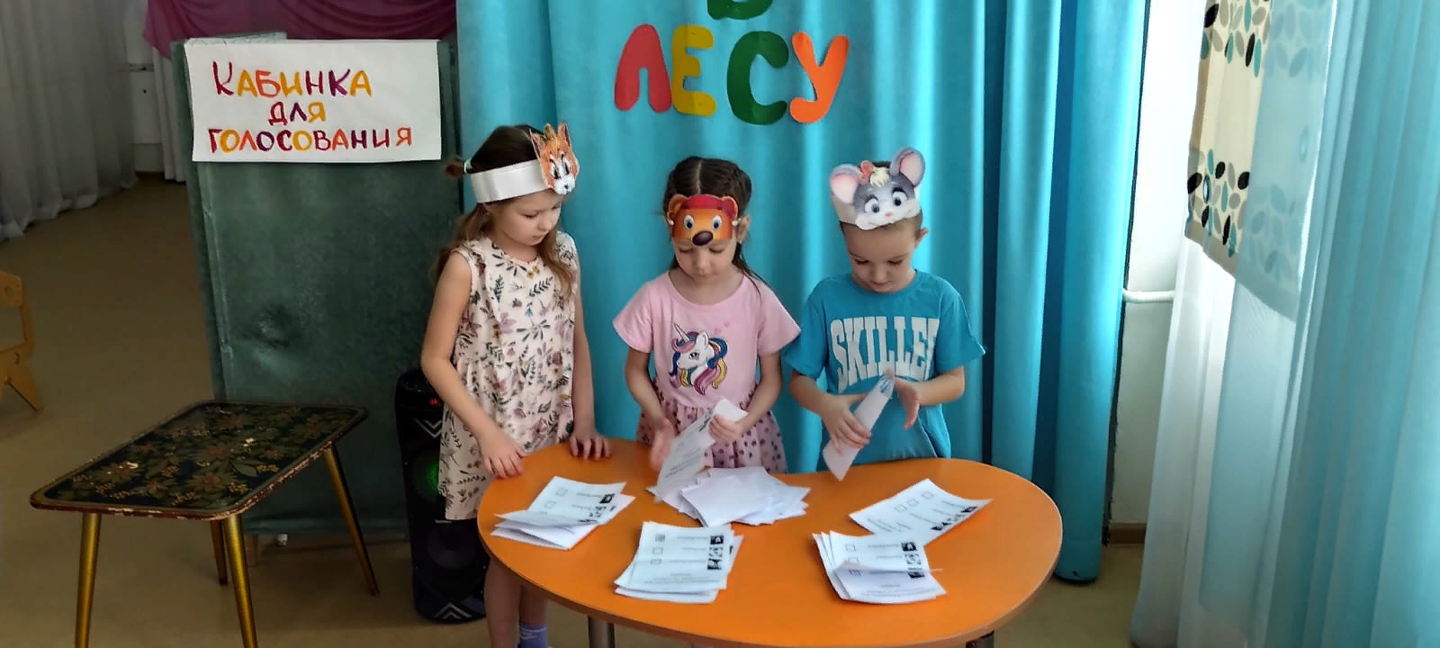 Дети-избиратели внимательно слушали кандидатов – Лису, Медведя и Филина. И большинством голосов выбрали достойного – Филина, который говорил о мире, согласии и справедливой жизни в лесу. Воспитанники полностью проиграли процедуру голосования – заполнение бланков, подсчет голосов и т.д.