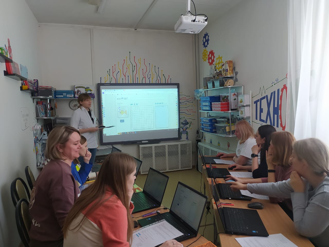 Вторая часть встречи прошла в форме практико-ориентированного мастер-класса «Решение основных алгоритмических задач Пиктомир, Котобот». Екатерина Сергеевна Соболева познакомила участников с образовательными цифровыми ресурсами, затем каждый педагог работал за ноутбуком, выполнял алгоритмические задачи на цифровом игровом поле, писал несложные программы.