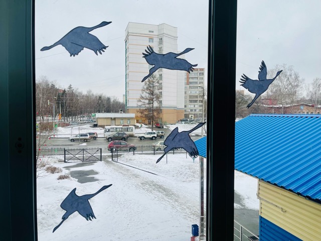 Все желающие приняли участие в онлайн-акции «Летят журавли»: на окнах школы размещены проекции журавлей, летящих ввысь. Также все неравнодушные создали записи на личной странице ВК с проекцией улетающих в небо журавлей и хэштегами #журавли, #мывместе (https://vk.com/sharing#/33700).