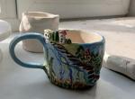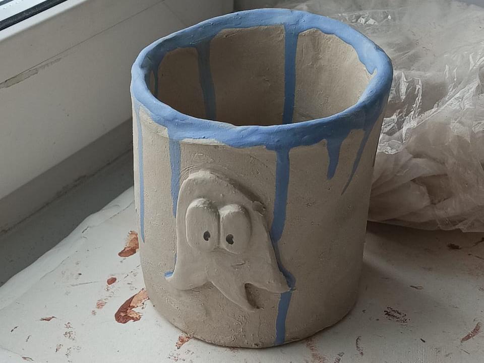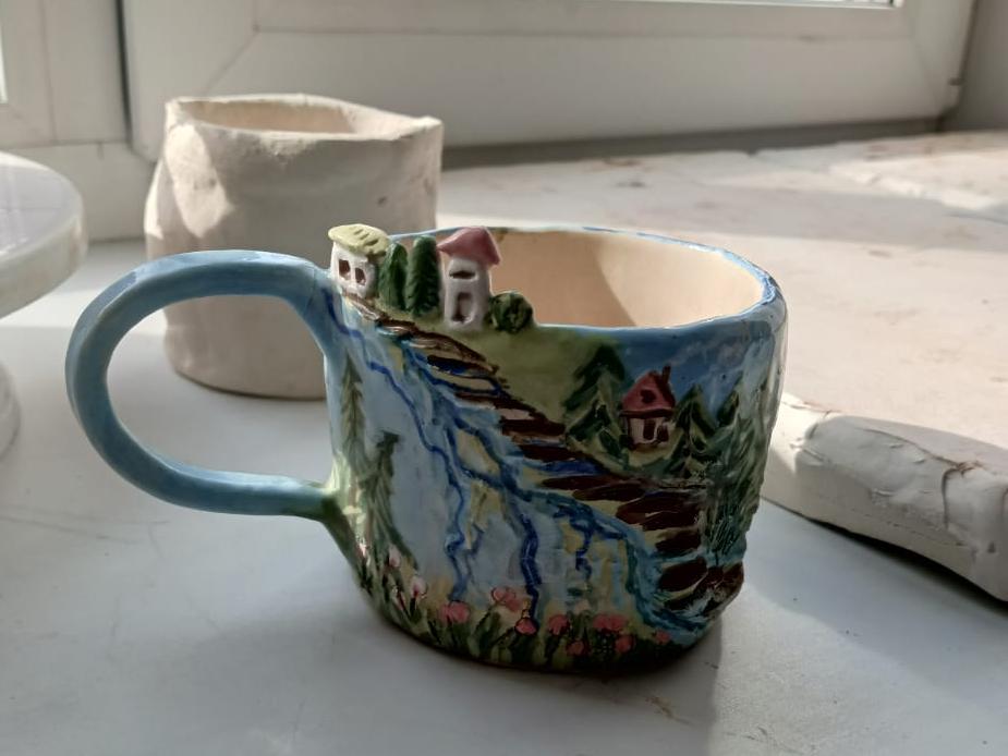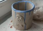 В ходе работы педагог предложила участникам украсить кружки надписями, фигурками, различными авторскими символами. Так появились бокал с привидением (барельеф), чашка с домиком на донышке и кошкой на бортике и другие забавные детали.