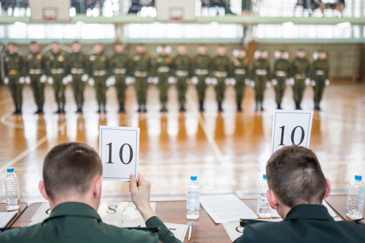 В ходе смотра жюри оценивало обязательную программу, представленную каждым взводом по следующим критериям: вход в зал и построение команды, внешний вид, одиночная строевая подготовка, перестроение в две шеренги и обратно, повороты в двухшереножном строю, построение в колонну по три, прохождение торжественным маршем с воинским приветствием, строевой шаг, исполнение строевой песни и действия командира.