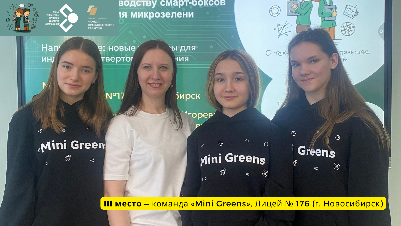III место – команда «Mini Greens» (проект «Производство смарт-боксов для выращивания микрозелени», МАОУ «Лицей № 176»), наставник Т. И. Семякина.