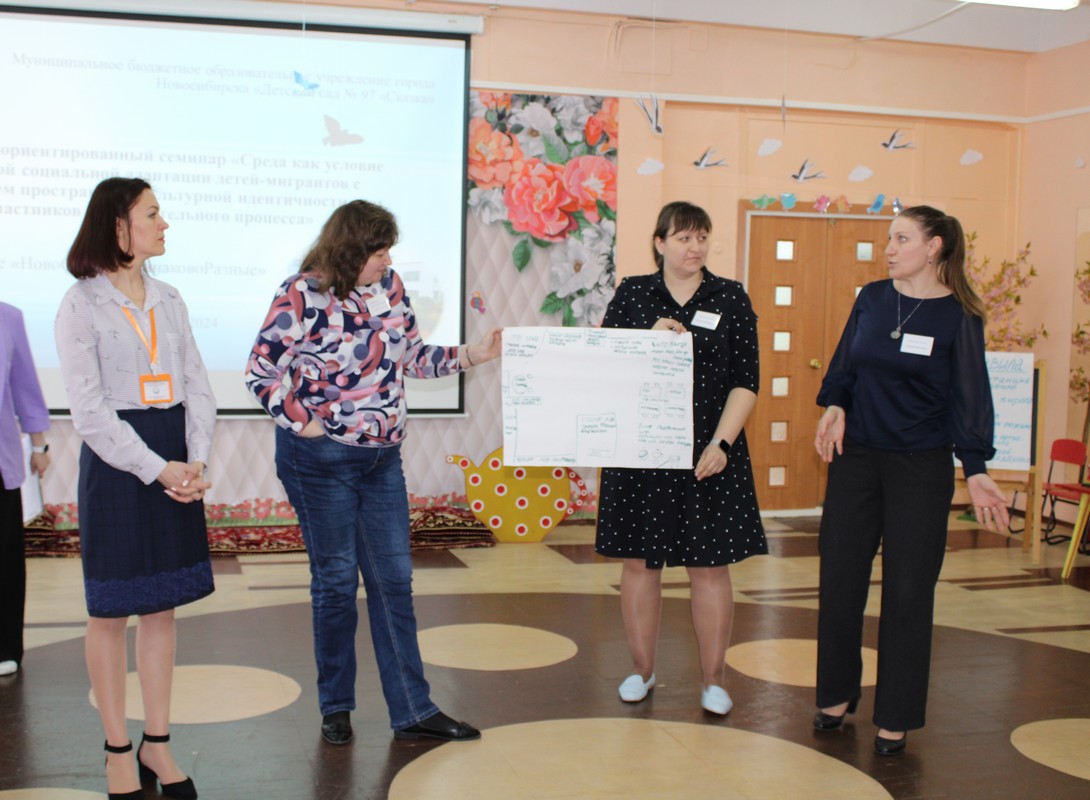 В рамках мероприятия педагоги детских садов-стажеров рассмотрели нормативно-правовую базу по работе с семьями детей-мигрантов, познакомились с понятийным словарем по направлению работы стажировочной площадки, обсудили в подгруппах и разработали модель развивающей среды группового помещения, которая позволит успешно адаптироваться ребенку из семьи иностранных граждан к социальной действительности.