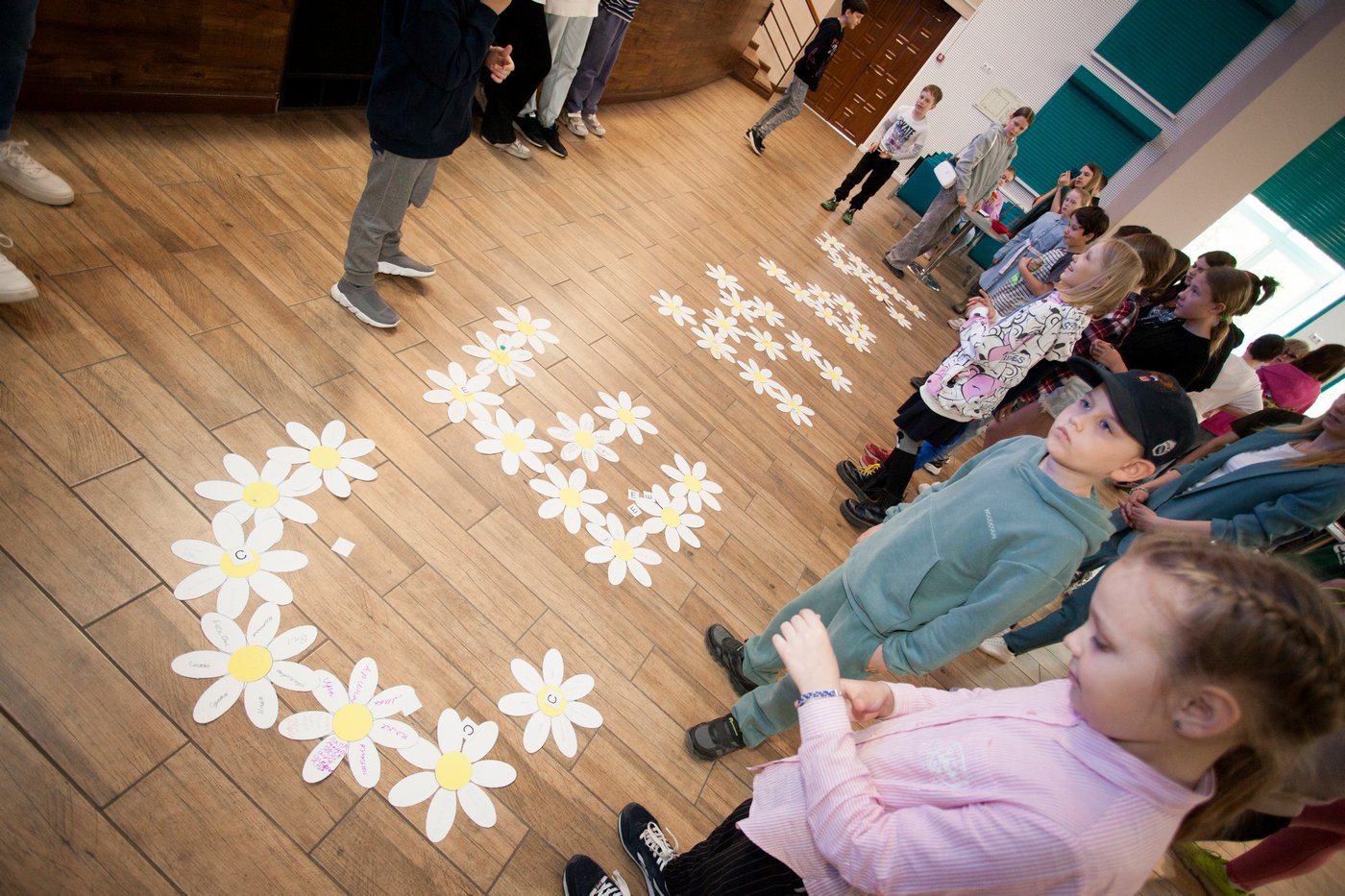 Идея культурно-развлекательной программы заключалась в том, что, проходя все игровые этапы: викторину «Семейный тур», танцевальный флешмоб «Родина моя», мастерскую «Раз – ромашка, два – ромашка…», участники встречи постепенно собирали пазл, в котором было зашифровано слово «СЕМЬЯ», составленное из цветов ромашки – символа семьи. Такую же композицию ребята вместе со взрослыми выложили из тех ромашек, которые они сделали своими руками, принимая участие в мастерской. Удивительная вовлеченность каждого в общий творческий процесс, эмоции радости, ощущение причастности к важному, доброму, созидательному – всё это стало прекрасным результатом праздника.