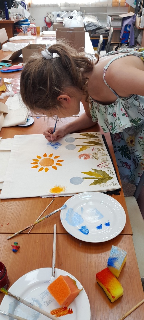 Все участники профильной смены освоили секреты верховой набойки и стали обладателями практичных экосумок с оригинальными узорами.