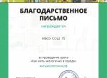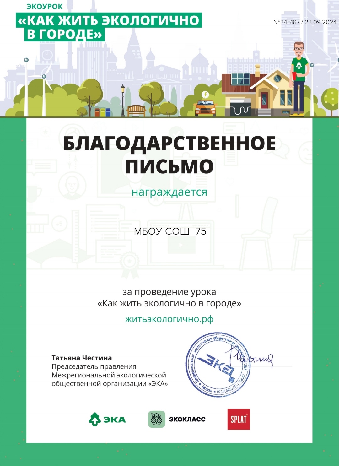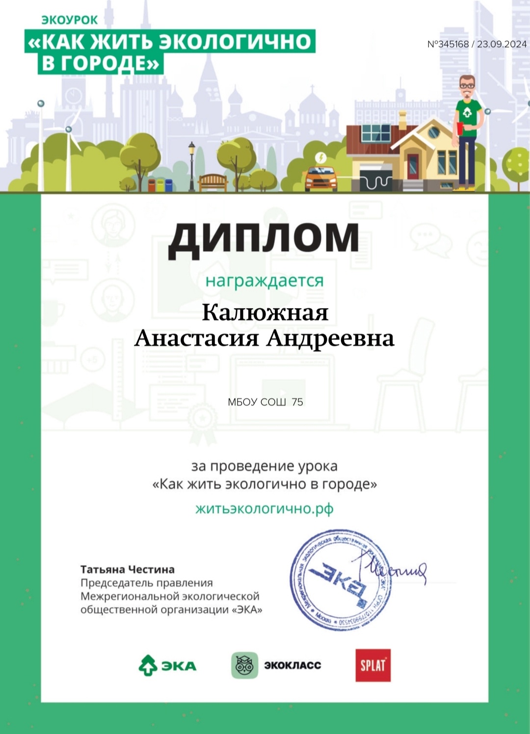 В школе № 75 большое внимание уделяется экологическому просвещению и воспитанию обучающихся. Учитель Колюжная Анастасия Андреевна в рамках образовательного проекта «Как жить экологично в городе» провела цикл Всероссийских экологических уроков для обучающихся.