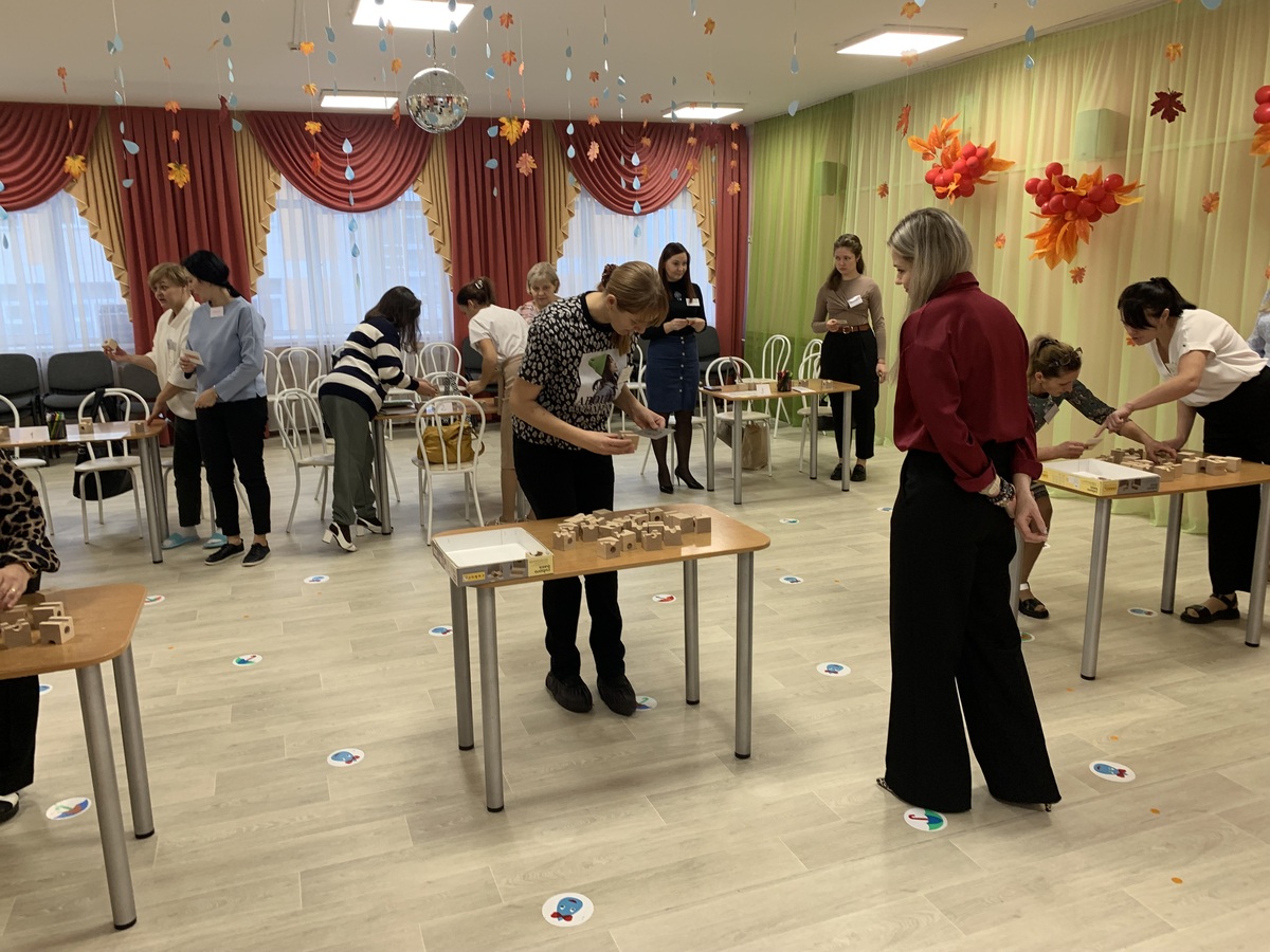 Мастер-класс начался с приветствия и игры «Портрет группы», что позволило педагогам поздороваться и комфортно взаимодействовать в процессе освоения новых знаний. Воспитатель МАДОУ д/с № 44 Евгения Сергеевна Ковалева познакомила педагогов с опытом детского сада по включению конструктора CUBORO в образовательный процесс.