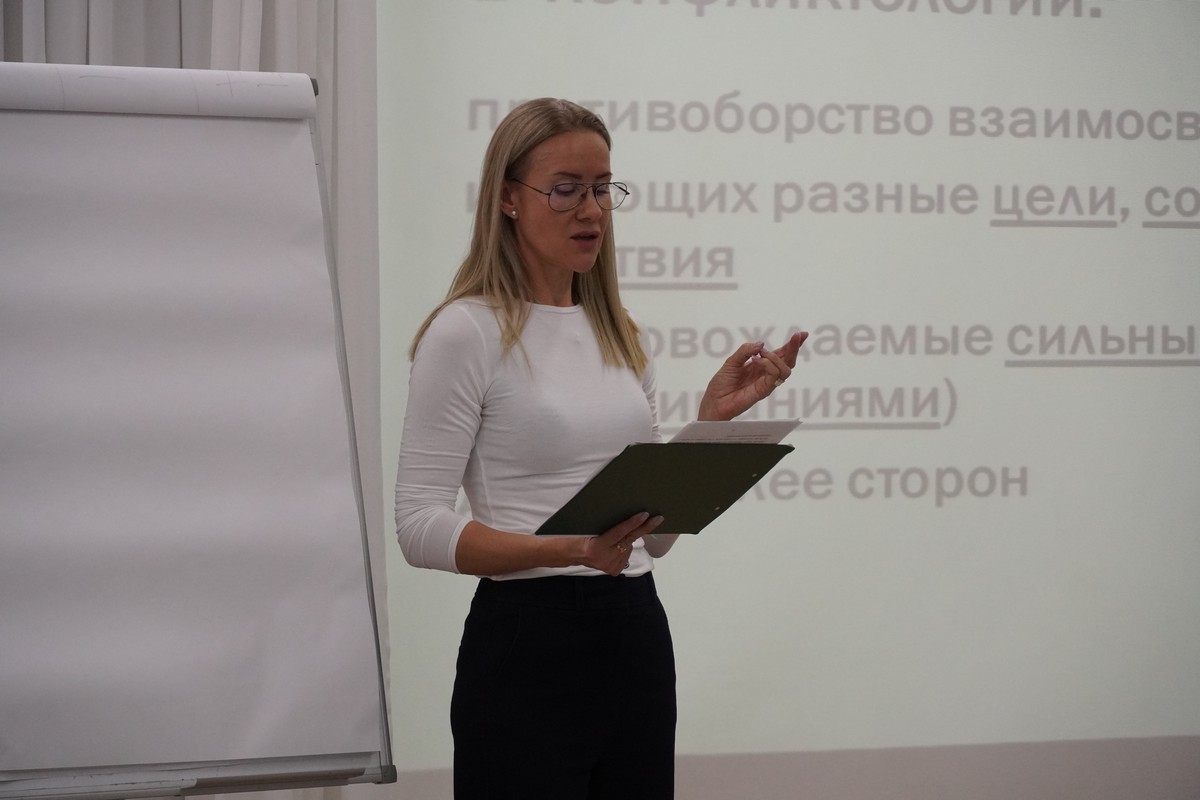 Семинар начался с обсуждения регламента, правил, приветствия-ледокола и интеллектуальной разминки. Педагоги строили ментальную карту «Конфликт – это…», в ходе подгрупповой работы отмечали положительные и отрицательные стороны конфликта. После мини-лекции об уровнях, структуре, видах конфликтов участники обсуждали теоретические и практические аспекты управления конфликтами. Большой практический раздел был посвящен профилактике конфликтов с родителями: через проблемно ориентированный анализ педагоги определяли, кто такие трудные родители, как проявляются трудности, обсуждали возможные причины. Работа в подгруппах была направлена на обсуждение способов предотвращения конфликтов, выработку рекомендаций по взаимодействию с родителями. Главный вывод – профилактикой конфликтов является полное, исчерпывающее, своевременное, доступное информирование родителей.