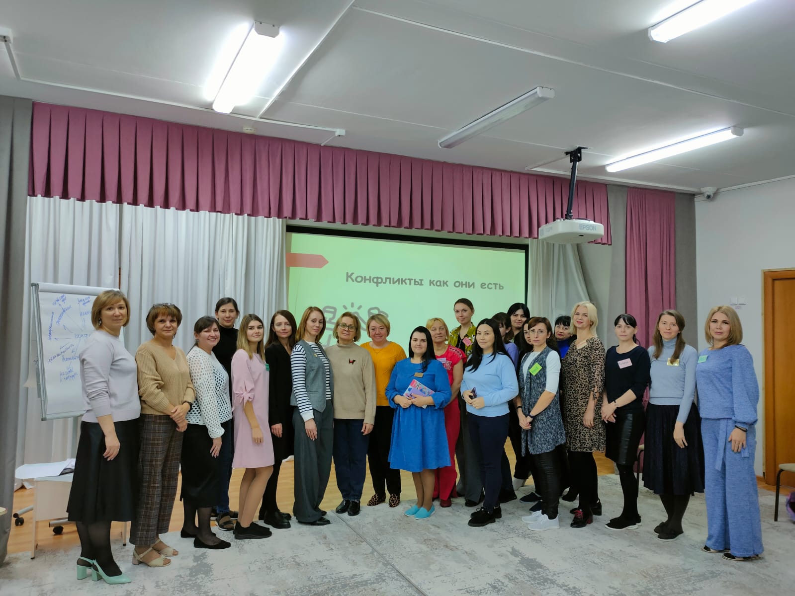 21-22 ноября на базе детского сада № 59 проведен интерактивный семинар с элементами тренинга «Конфликты как они есть» в рамках реализации новых форматов методической работы МАУ ДПО «НИСО». Концепция семинара была направлена на актуализацию теоретических знаний, профилактику, совершенствование практических навыков поведения в конфликтах. Ведущей семинара выступила Светлана Михайловна Оберемок, эксперт МАУ ДПО «НИСО», соведущими – Вера Александровна Мелькова, старший методист МАУ ДПО «НИСО»; Татьяна Павловна Курбасова, старший методист МАУ ДПО «НИСО»; Ольга Владиславовна Магденко, педагог-психолог МАДОУ д/с № 59; Анна Владимировна Игольникова, педагог-психолог МБДОУ ЦРР – д/с № 501.
