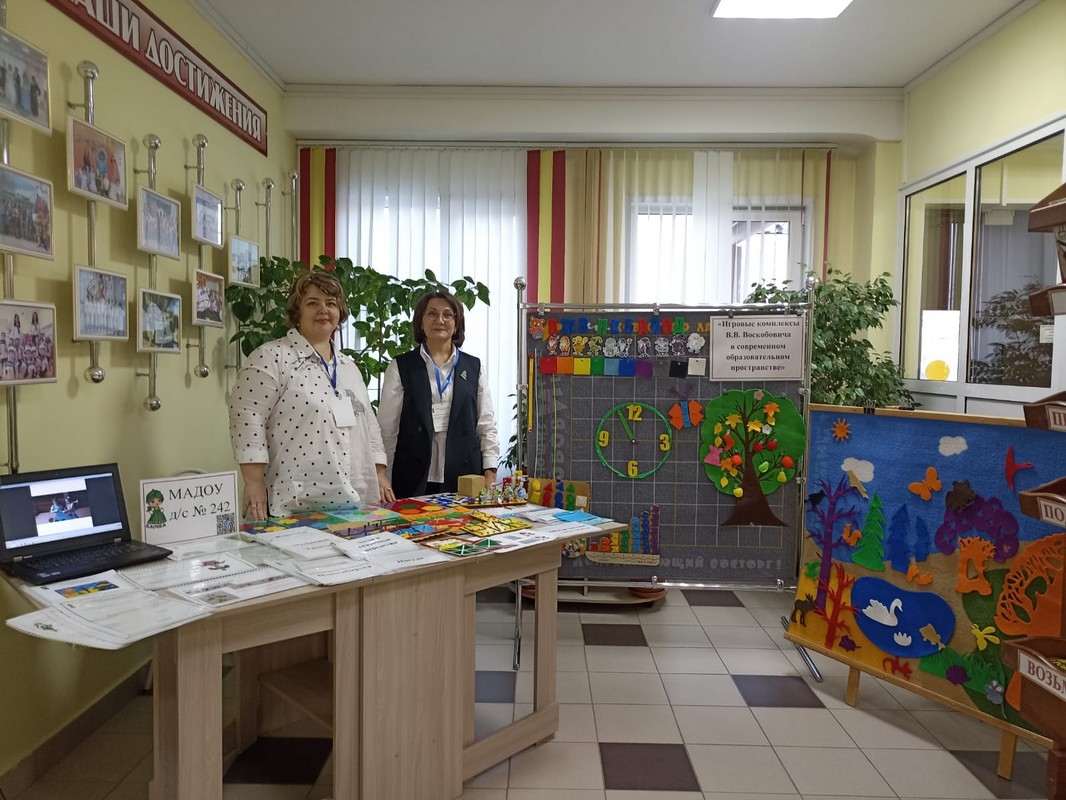 – Фиткулина Г. Г., заместитель заведующего по УВР МАДОУ д/с № 242, и Косачева Т. А., старший воспитатель, представили стенд «Игровые комплексы В. В. Воскобовича в современном образовательном пространстве».