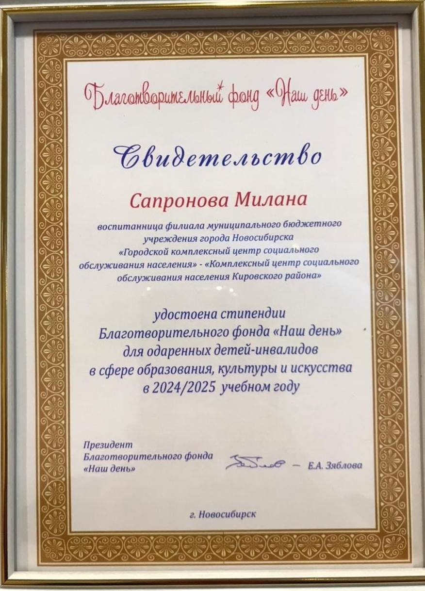 Сапронова Милана, ученица 10 «А» класса, показала высокие достижения в сфере танцевального творчества. Является победителем региональных и всероссийских смотров, конкурсов и фестивалей. В 2023 году Милана Сапронова защищала честь города Новосибирска в «Специальной олимпиаде России», проходившей в г. Казань, где завоевала сразу три первых места: