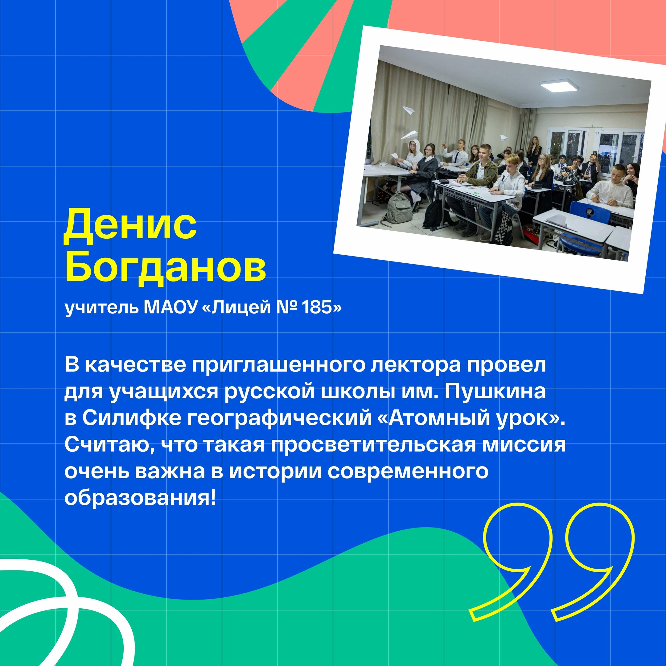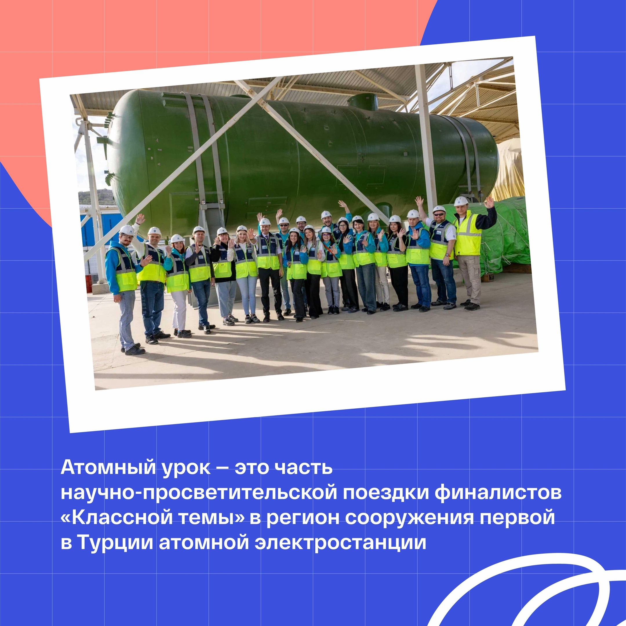 Финалисты конкурса «Классная тема!» и амбассадоры проекта «Атомный урок» побывали на крупнейшей стройке современной атомной промышленности – площадке сооружения АЭС «Аккую» в Турции. В их число вошел Денис Геннадьевич Богданов, учитель географии МАОУ «Лицей № 185».